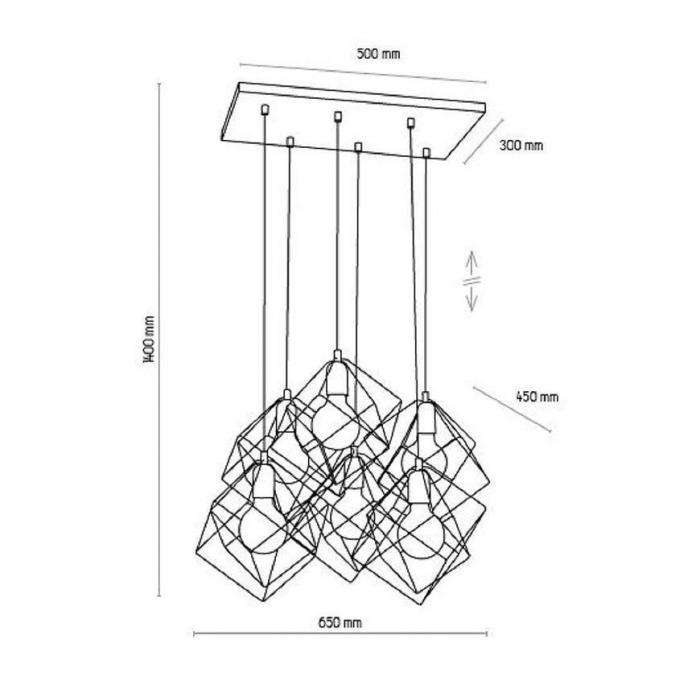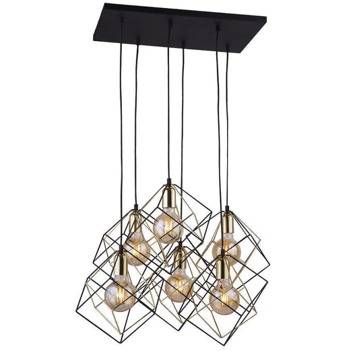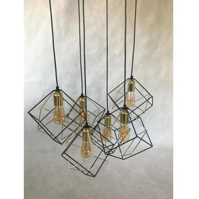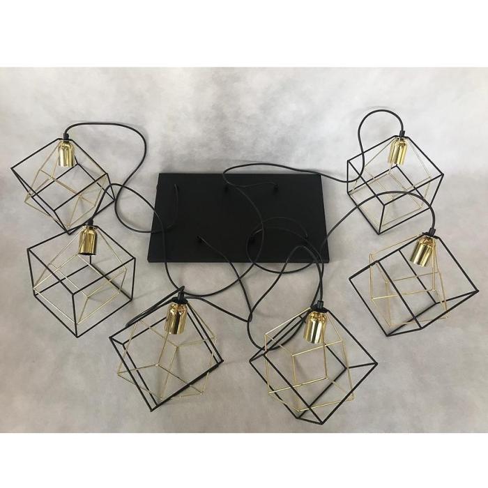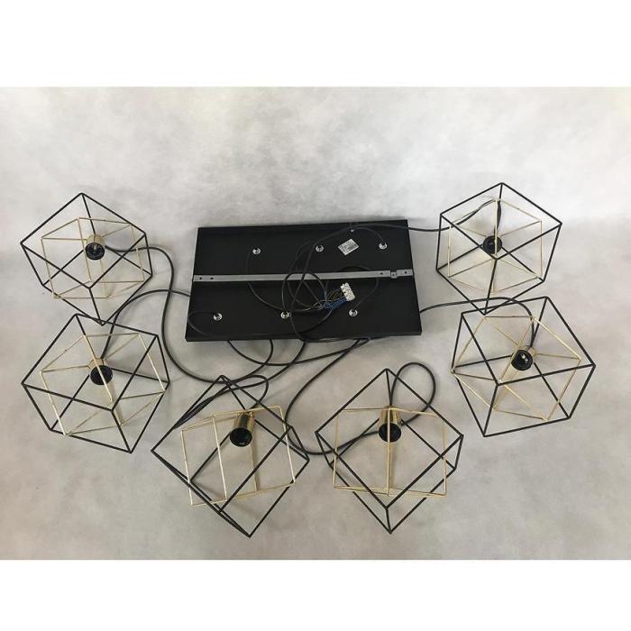 Nowoczesna Lampa Alambre z sześcioma punktami światła, zamkniętymi w geometrycznych, metalowych kloszach. Ciekawa konstrukcja i połączenie dwóch kolorów złota i czerni tworzą oryginalną kompozycję ścienną. Klosze wykonane są z delikatnych, cienkich drucików. Lampa sprawdzi się w nowoczesnych, industrialnych wnętrzach, tworząc odpowiedni ich klimat.