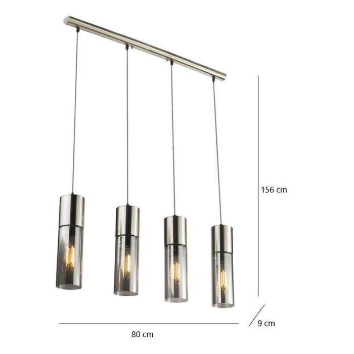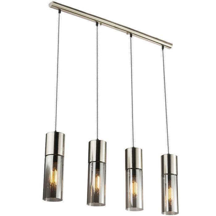Lampa wisząca w kolorze chromu satynowego, klosze to szkło przydymione, a kabel w oplocie tekstylnym w kolorze czarno-biały.
