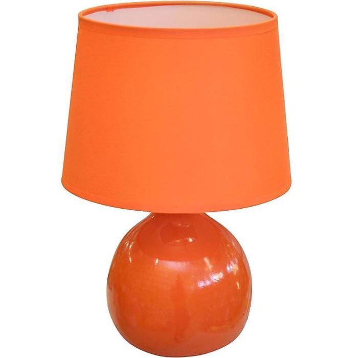 Lampka zbliżona kształtem do kuli z abażurem w kolorze pomarańczowym.