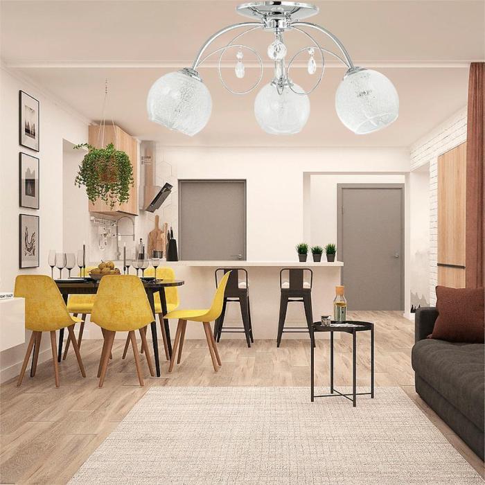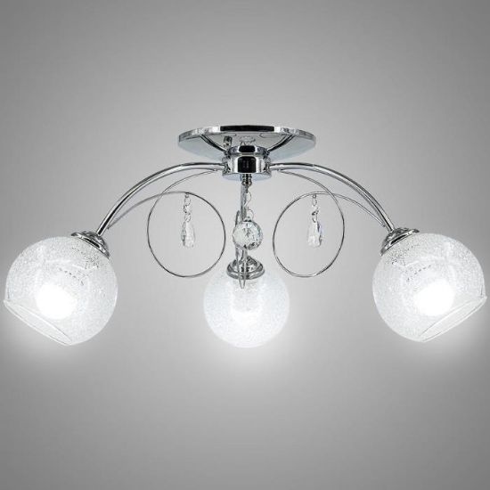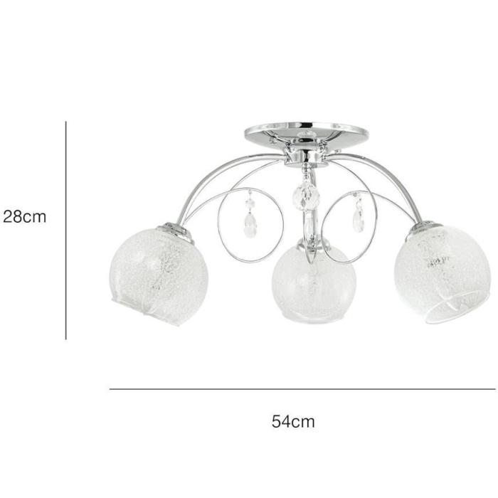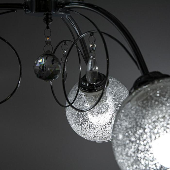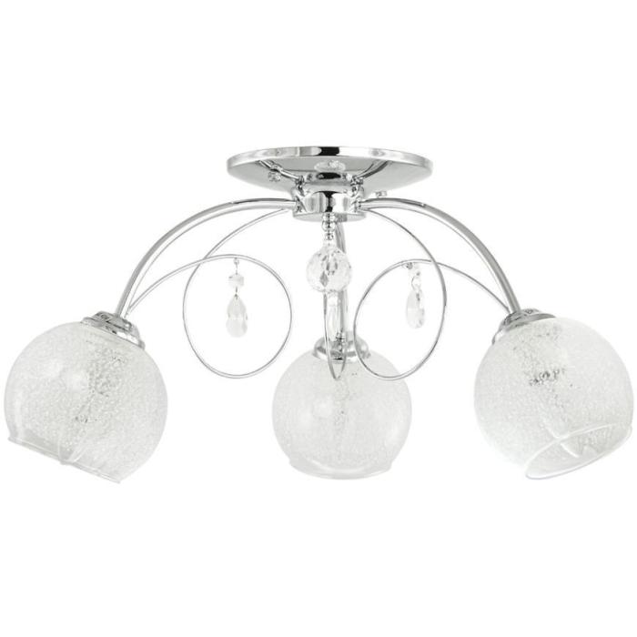 Lampa sufitowa wykonana z metalu w kolorze chromu, szklane klosze i kryształki.