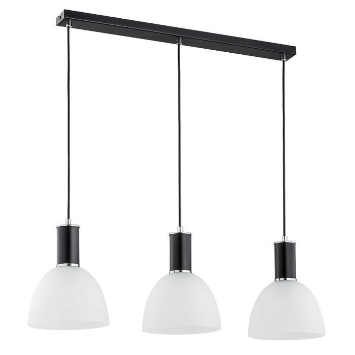 Lampa wisząca metalowa z trzema kloszami.
