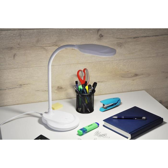 Lampa biurkowa SM-7791W WHITE LB1 łączy nowoczesny wygląd z funkcjonalnością. Lekka konstrukcja i kompaktowe wymiary umożliwiają łatwe ustawienie lampy na biurku, a regulacja kierunku światła zwiększa komfort pracy i nauki. Zintegrowane LED pozwala na energooszczędne oświetlenie miejsca pracy przy minimalnym zużyciu energii.