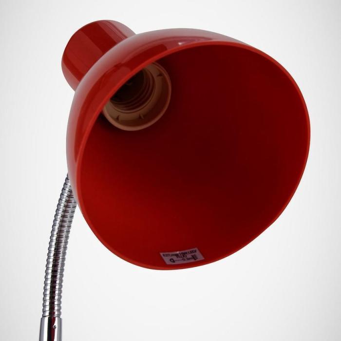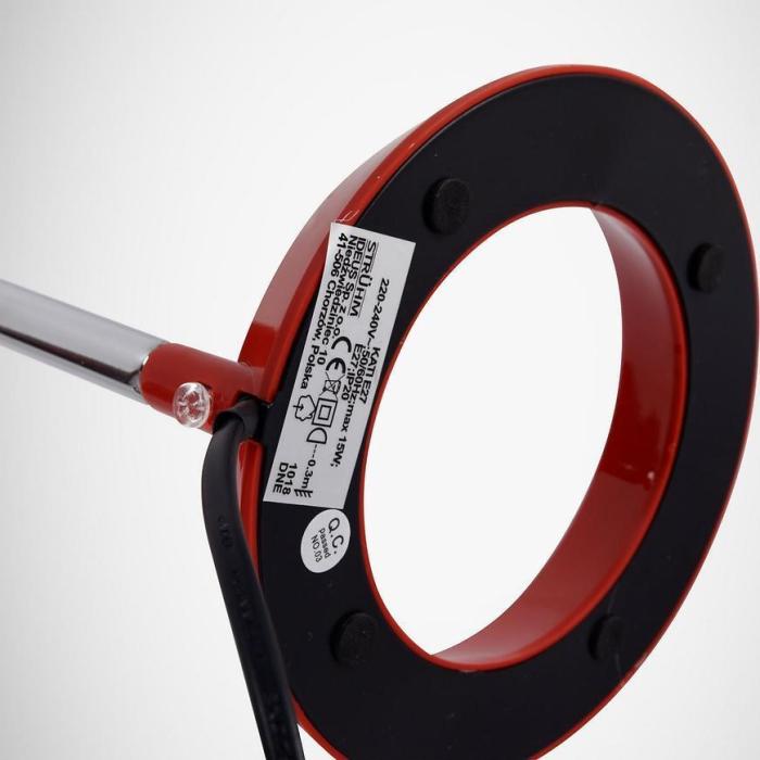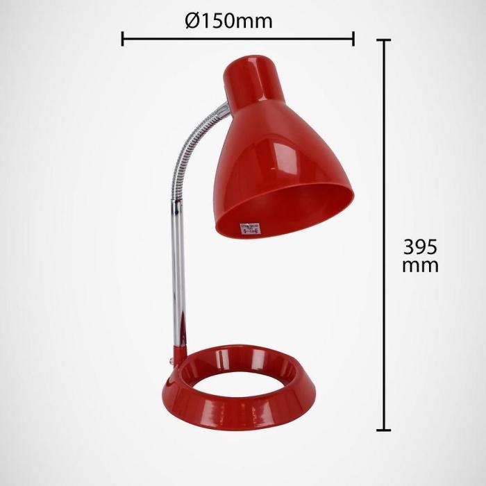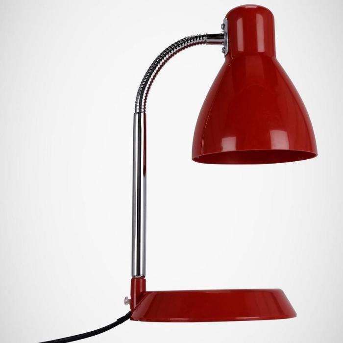 Lampa biurkowa w kolorze czerwonym. Lampka posiada włącznik.