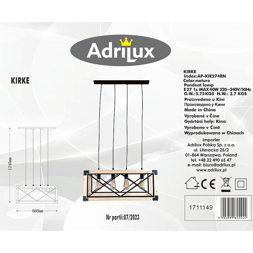 Lampa Kirke AP-KIE274RN LW3 to elegancka lampa sufitowa o czarnym wykończeniu i nowoczesnym designie. Wyposażona w 4 punkty świetlne z gwintem E27, pozwala na zastosowanie żarówek o mocy do 40W każda. Regulowana wysokość umożliwia dopasowanie do wnętrza, a solidne wykonanie z mieszanych materiałów gwarantuje trwałość. Idealna do salonu, jadalni czy sypialni, zapewnia efektowne oświetlenie przy zasilaniu sieciowym 230V.