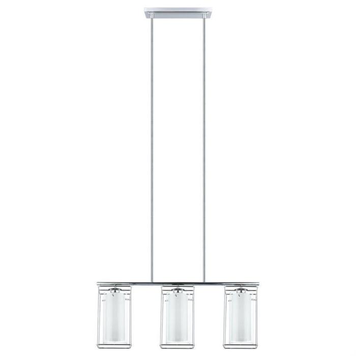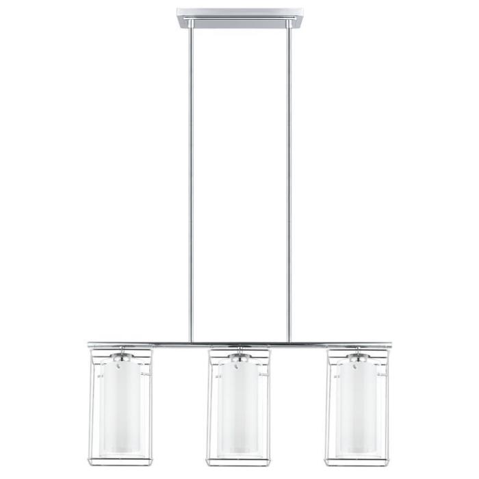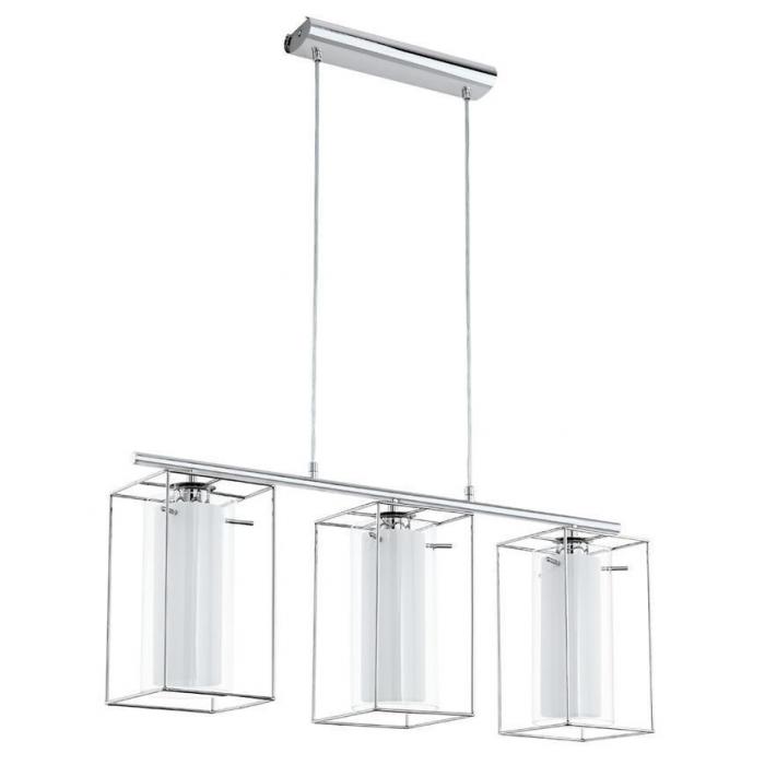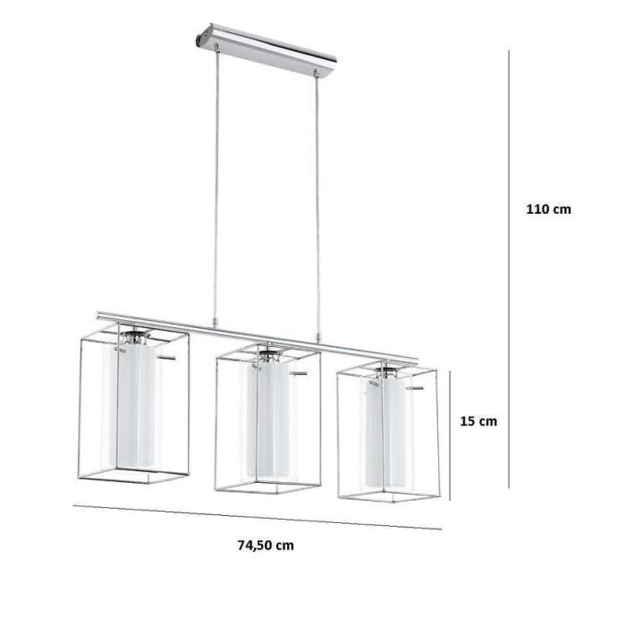 Nowoczesna, designerska lampa wpasuje się idealnie w nowoczesne wnętrza. Lampa posiada 3 punkty świetlne zamknięte w szklanych kloszach, otoczonych metalową ramką. Do lampy należy dokupić żarówkę we własnym zakresie.