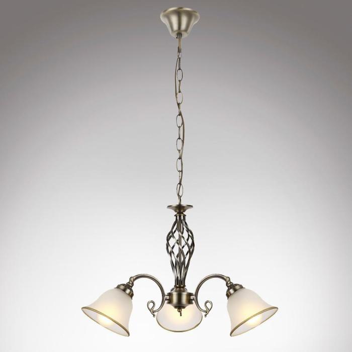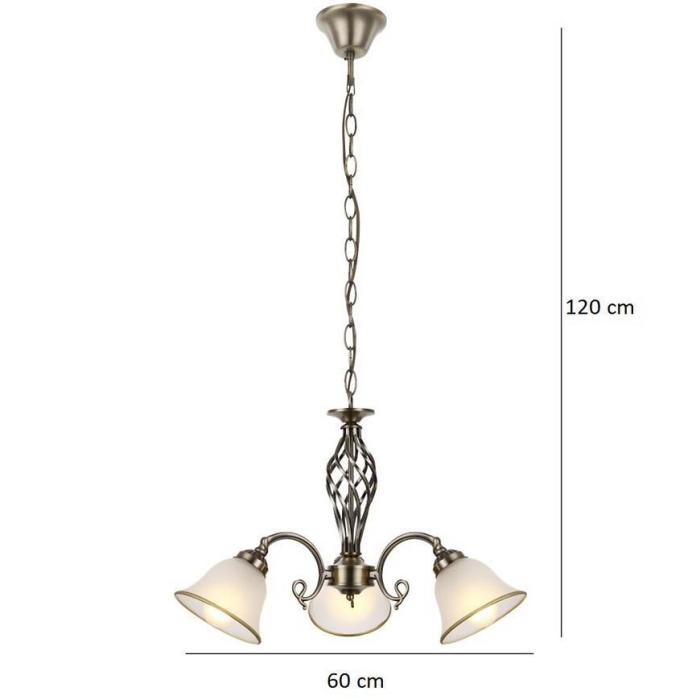 Lampa wisząca w kolorze starego złota oraz szklane klosze w kolorze satyny.