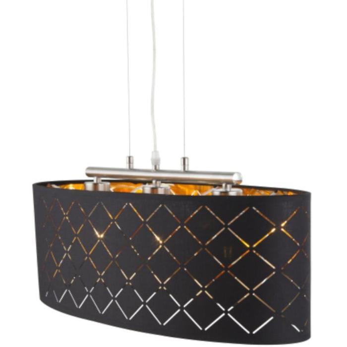 Lampa wisząca, satyna, abażur tekstylny w kolorze czarnym i złotym z dekorem.