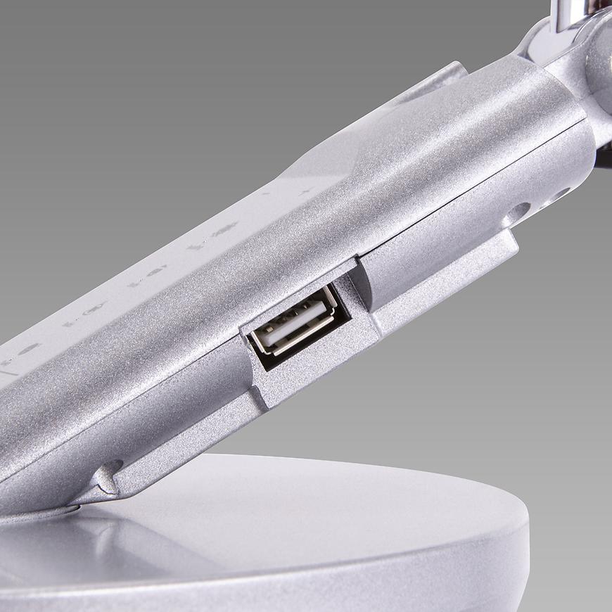 Lampa Ramzes LED Silver 03892 LB1 to elegancka, funkcjonalna lampa biurkowa w srebrnym kolorze, wykonana z trwałego ABS i stali. Wyposażona w energooszczędne źródło LED o mocy 7,5W z regulowaną barwą światła (ciepła, neutralna, zimna), oferuje komfortowe oświetlenie dopasowane do potrzeb użytkownika. Lampa posiada funkcję przyciemniania oraz możliwość zmiany kierunku światła, co ułatwia precyzyjne ustawienie. Zasilana jest sieciowo (230V), posiada klasę ochronności II/III i klasę szczelności IP20. Idealna do pracy, nauki i czytania.