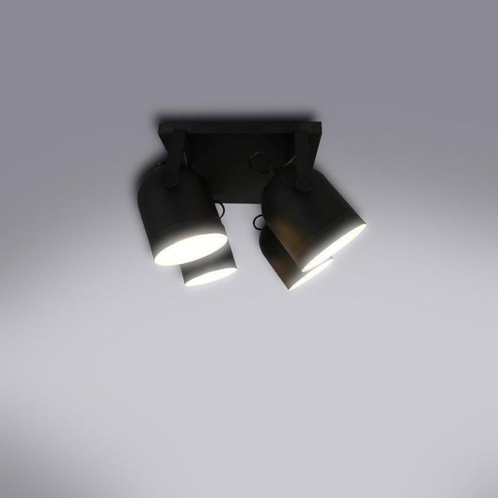 Lampa posiada cztery źródła światła, które nadadzą przytulną atmosferę w pomieszczeniu. Klosz nadaje ciekawy wygląd lampie. Klosze mają możliwość zmiany kierunku oświetlenia. Całość została wykonana z metalu oraz tworzywa w kolorze czerni. Idealnie wpasuje się w takie wnętrza jak sypialnia, jadalnia czy salon, będąc nie tylko oświetleniem, ale zarówno dodatkową ozdobą wnętrza. Wniesie do pomieszczenia nowoczesność oraz elegancję.