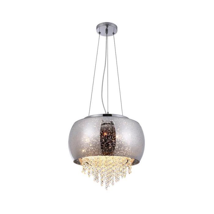 Lampa wykonana ze szkła z wiszącymi kryształkami. W chromowanej obudowie znajduje się miejsce na wymienne źródła światła z gwintem E14. ( nie są dołączone do zestawu)