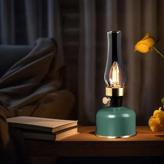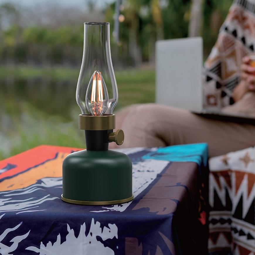 Lampa stołowa „naftowa” OLIA USB IP44 w kolorze zielonym to nowoczesna reinterpretacja klasycznego designu.