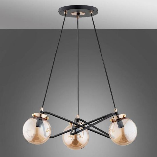 Lampa wisząca metalowa w kolorze czarnym/złotym ze szklanymi kloszami w kolorze transparentnym bursztynowym.