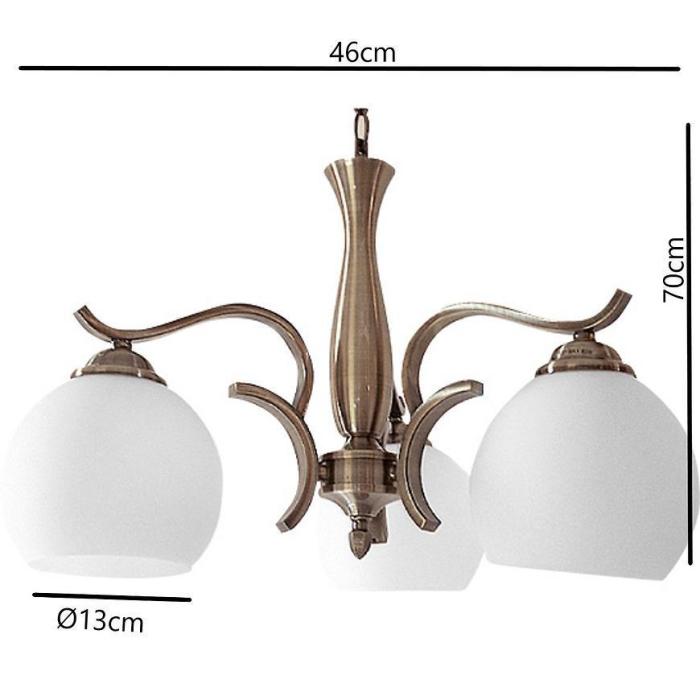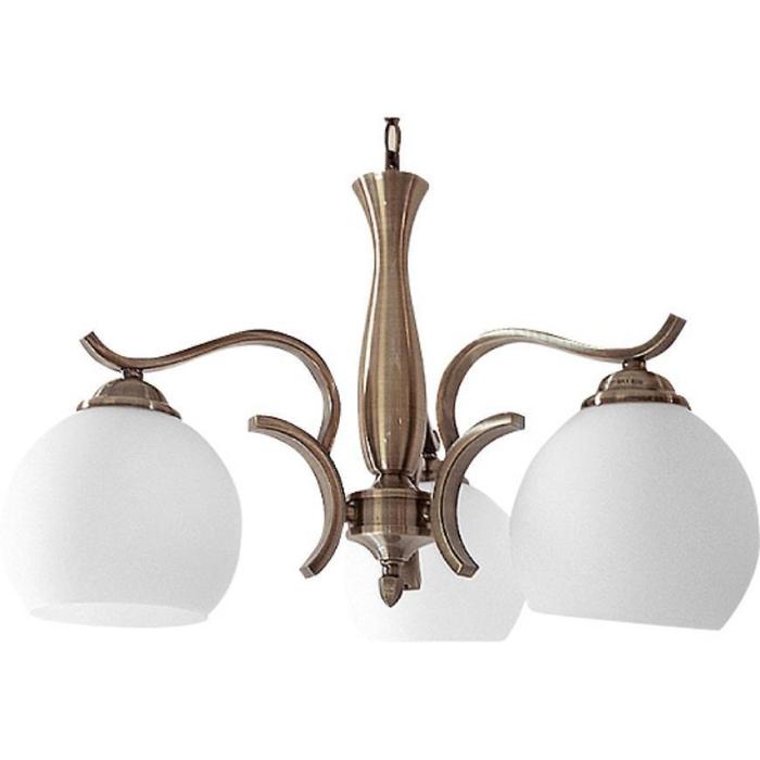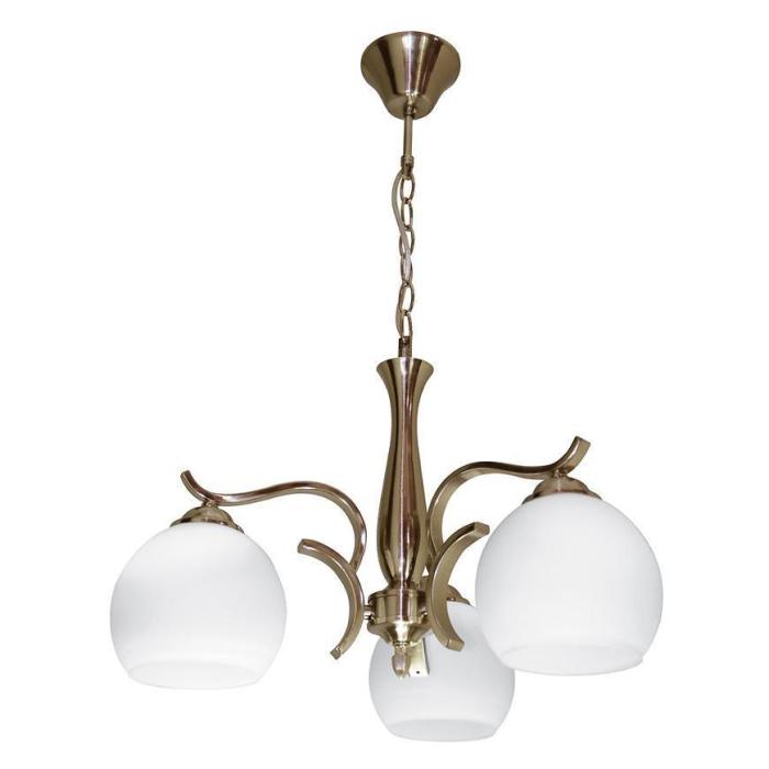 Lampa sufitowa wykonana z metalu w kolorze strego złota oraz szklane klosze.