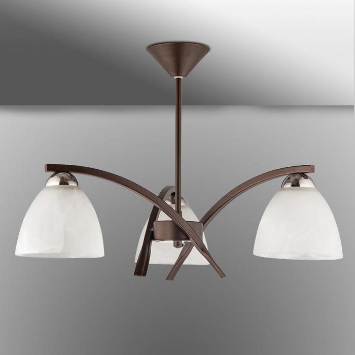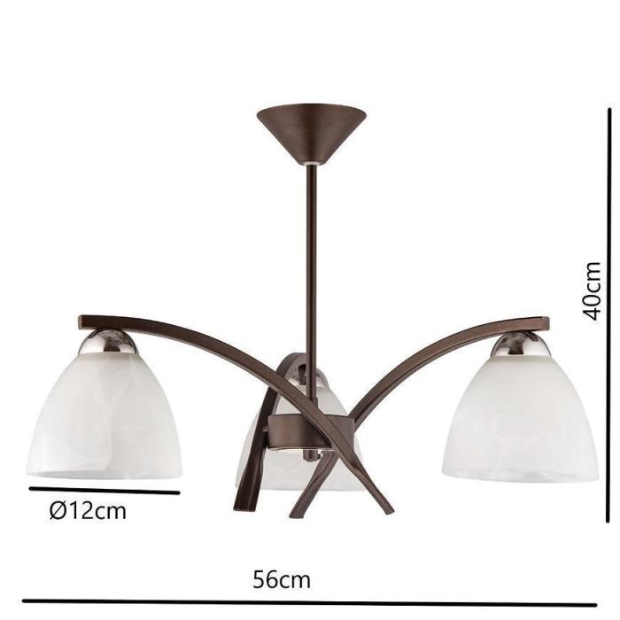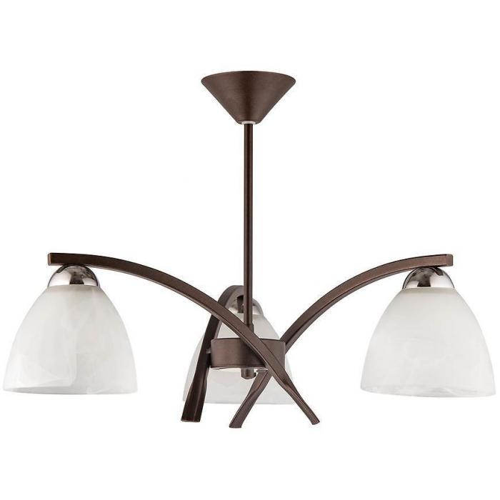 Klasyczna, o prostej budowie klosza Lampa w kolorze brązowym. Lampa posiada 3 punkty światła, zamknięte w szklanym, mlecznym kloszu. Ciekawa kompozycja dodatkowo sprawia, że lampa będzie ciekawym elementem wykończeniowym w pomieszczeniu, robiąc wrażenie nawet w dzień. Po zmierzchu natomiast odpowiednio doświetli każde pomieszczenie. Sprawdzi się w kuchni, jadalni, salonie czy przedpokoju. Do lampy nalezy dokupić żarówki.