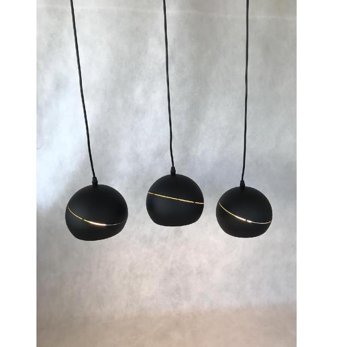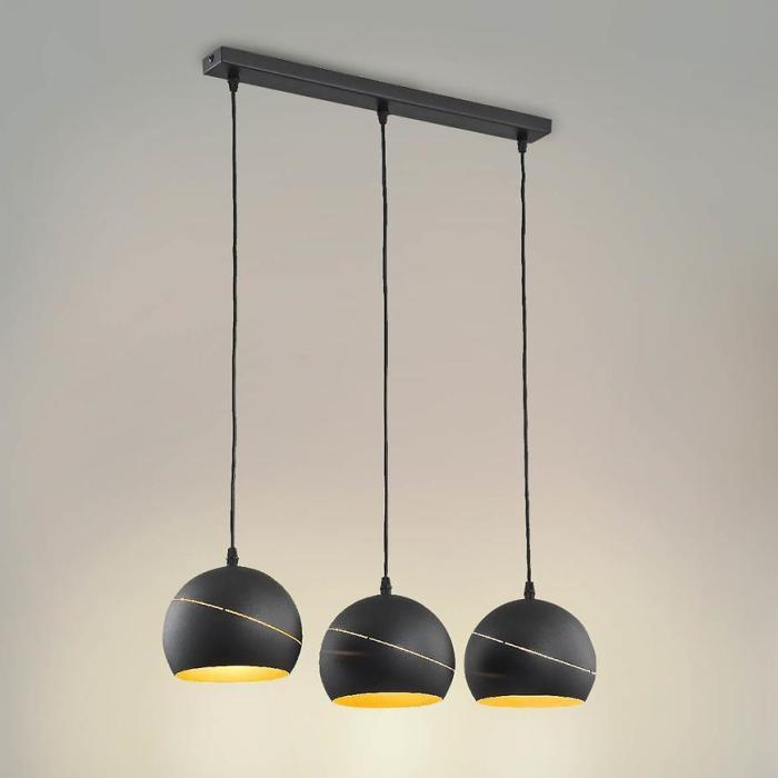 Stylowa i nowoczesna lampa będzie idealnym dodatkiem, szczególnie do salonu, kuchni lub jadalni. Posiada trzy miejsca na źródła światła z gwintem E27. Wykonana z metalu, posiada klosze w dwóch kolorach- czarny na zewnąrz, a wewnątrz jest złoty kolor.