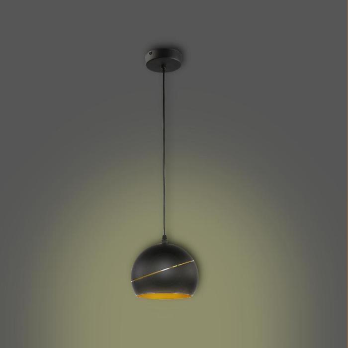 Stylowa i nowoczesna lampa będzie idealnym dodatkiem, szczególnie do salonu, kuchni lub jadalni. Posiada jedno miejsca na źródła światła z gwintem E27. Wykonana z metalu, posiada klosze w dwóch kolorach- czarny na zewnąrz, a wewnątrz jest złoty kolor.