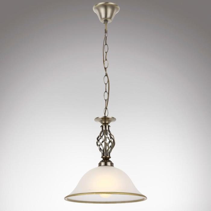 Lampa wisząca metalowa w kolorze starego złota, klosze to szkło satynowe.