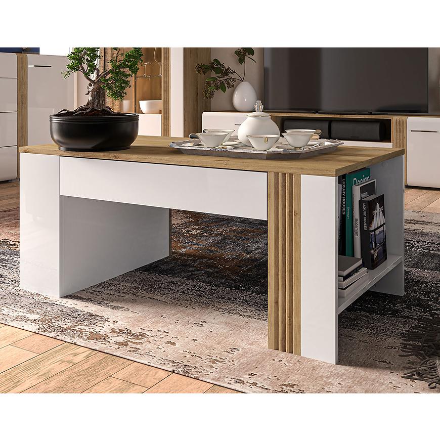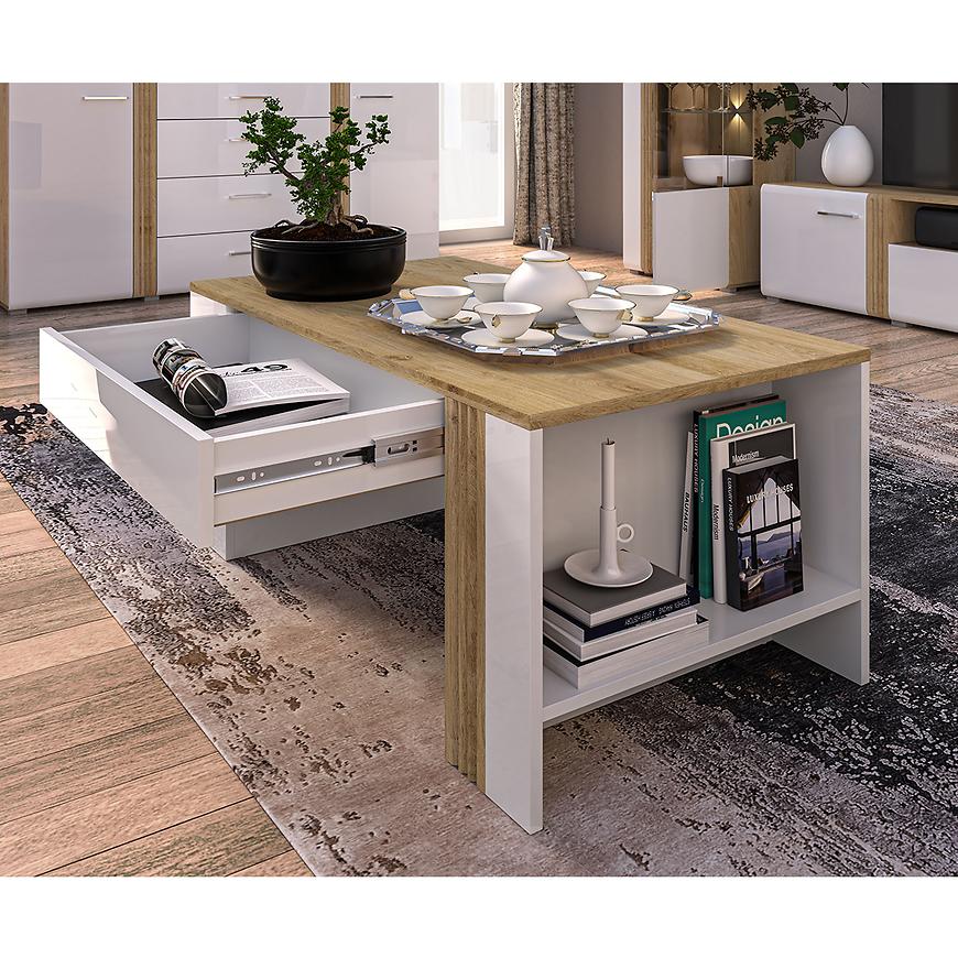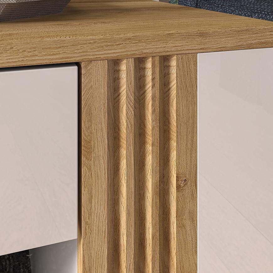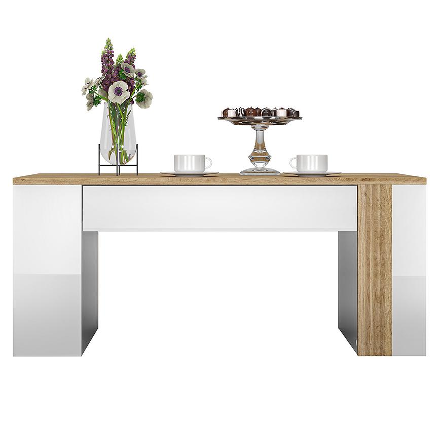 Ława Adagio 10 to wyjątkowy mebel w nowoczesnym stylu i intrygującym designie. Wybarwienie w dąb castello w połączeniu z białym połyskiem tworzy harmonijną i stylową kombinację, która przyciąga wzrok.
