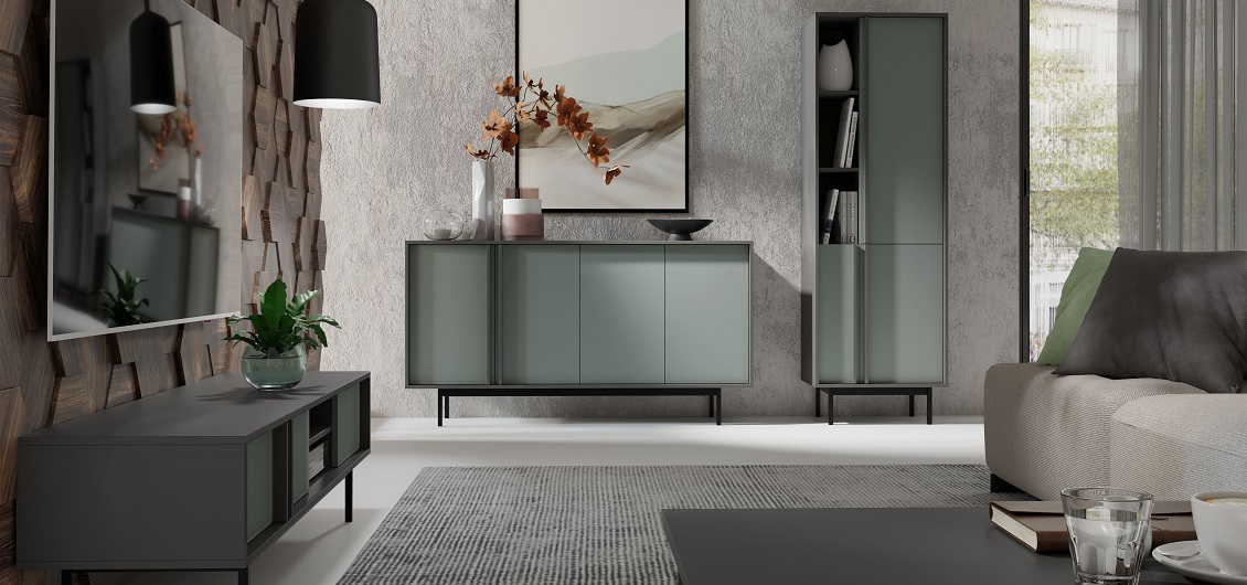 Kolekcja Alsy to propozycja dla osób, które chcą nadać swojemu pokojowi dziennemu wyjątkowy charakter. Połączenie głębokiego zielonego odcienia aloes na frontach z eleganckim antracytem korpusów tworzy wyrazisty kontrast, który staje się centralnym punktem aranżacji. Minimalistyczne formy, matowe wykończenie oraz solidne, wysokie metalowe nóżki sprawiają, że meble prezentują się nowocześnie, a jednocześnie lekko.