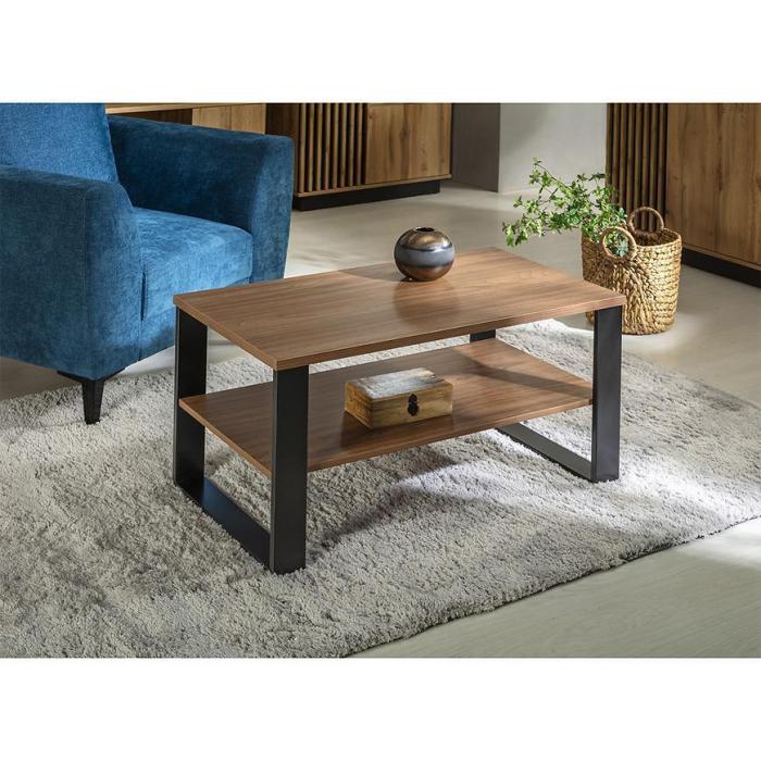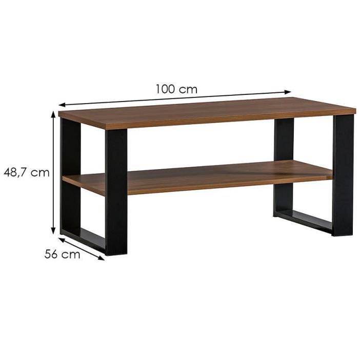 Stolik został wykonany z płyty laminowanej i metalowego stelaża w kolorze orzech/czarny.
