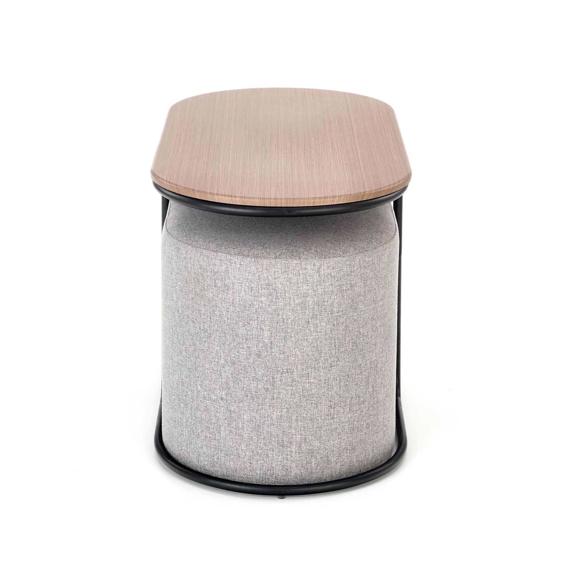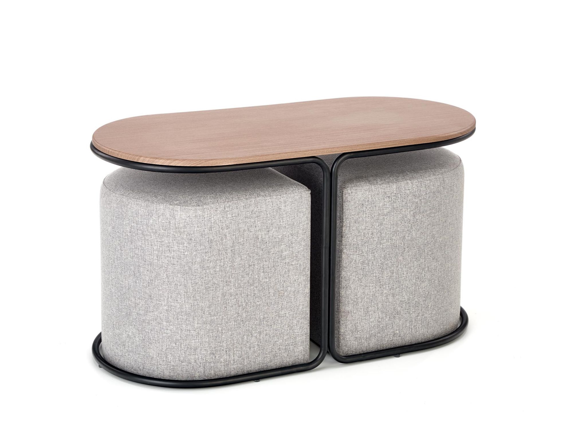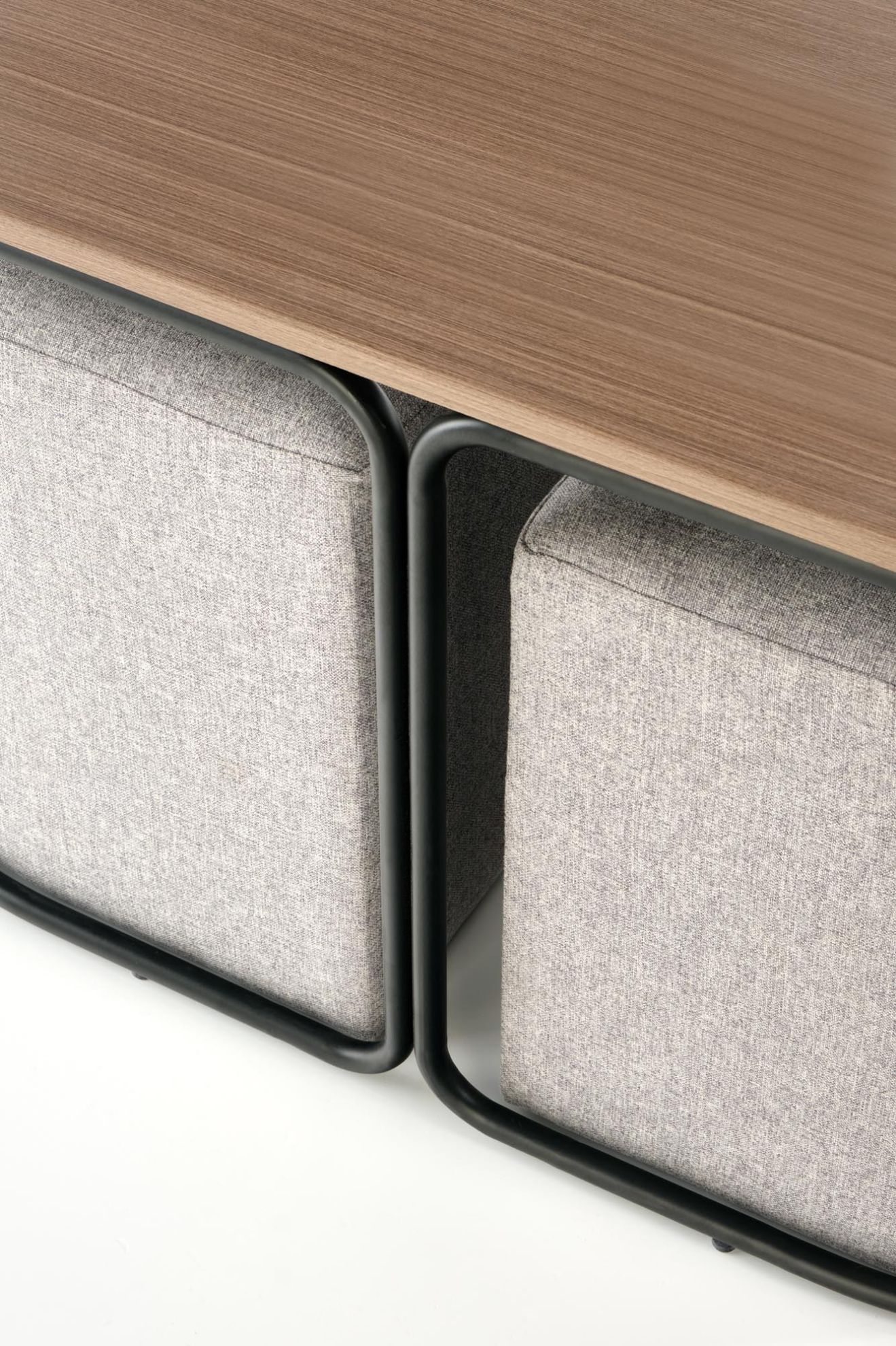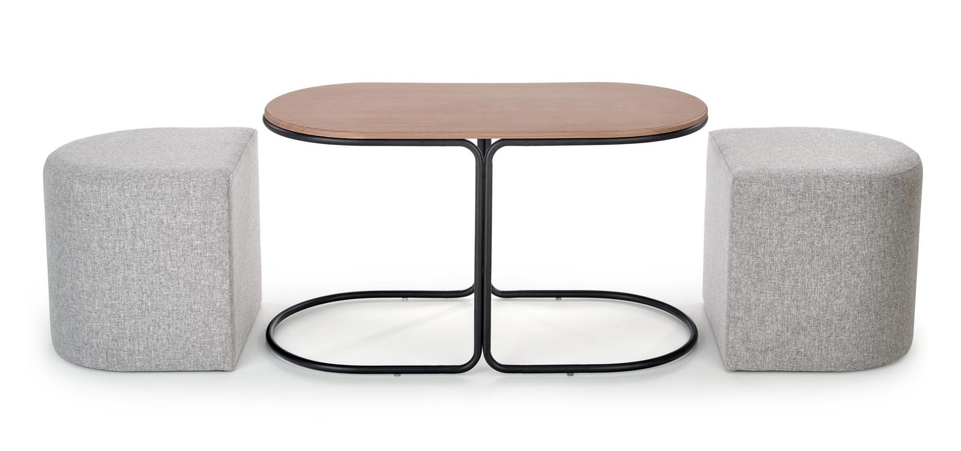 Blat ławy wykonany z MDF-u okleinowanego w kolorze orzechowym nadaje meblowi naturalnego i ciepłego charakteru. Konstrukcja ławy wykonana jest ze stali malowanej proszkowo, która zapewnia solidność, wytrzymałość i stabilność. Kolor czarny w połączeniu z orzechem nadaje meblom nowoczesnego i kontrastowego wyglądu, tworząc harmonijne połączenie kolorów. Pufy, wykonane z wytrzymałej tkaniny w kolorze popielatym, zapewniają dodatkowe miejsce do siedzenia i komfort użytkowania. Ich miękka tapicerka gwarantuje wygodę, a jednocześnie dodaje wnętrzu przytulności i elegancji.