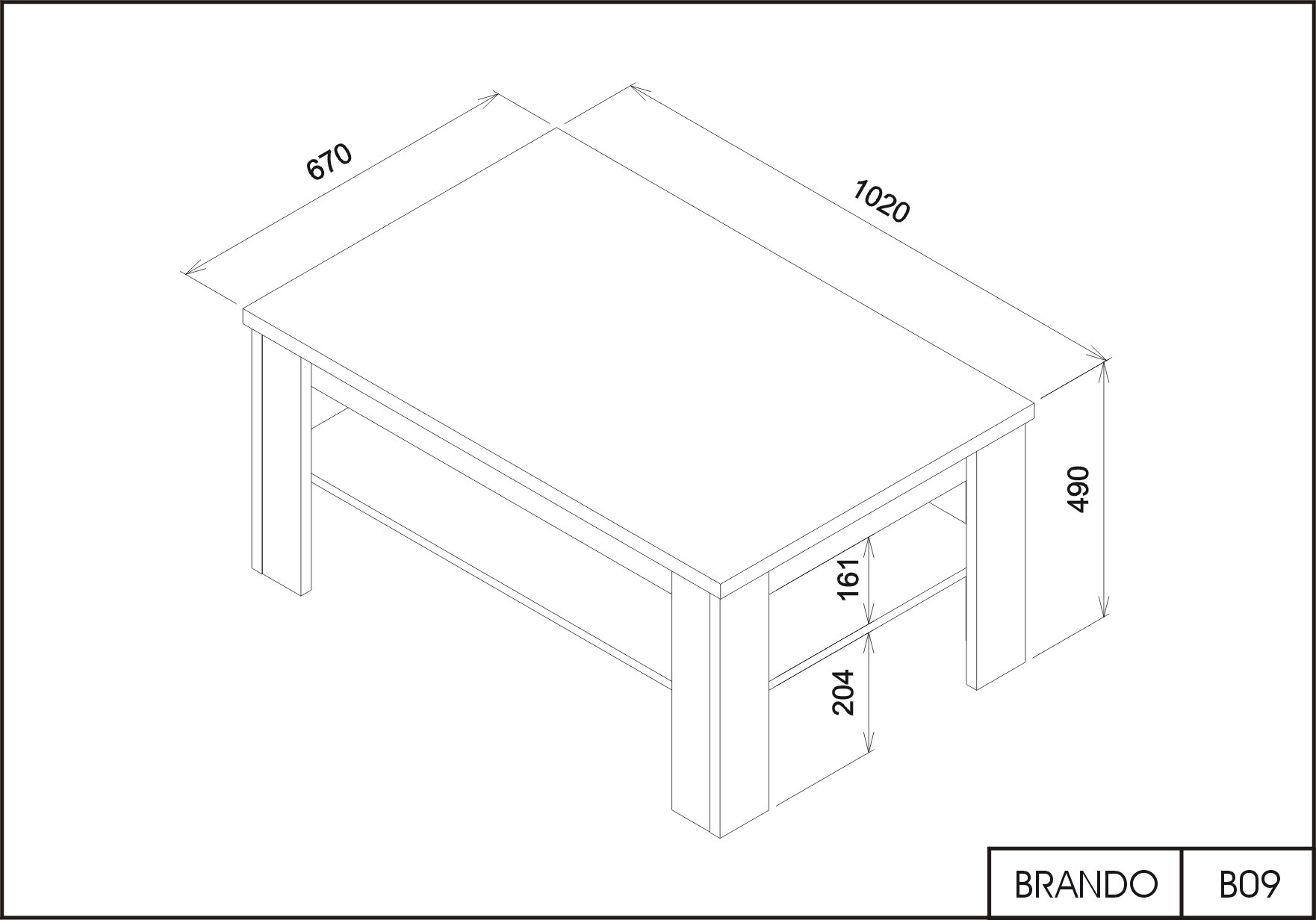 Ława Brando B09 jest idealnym sposobem, aby stworzyć jedną spójną kompozycję pomieszczenia razem z innymi meblami z tej serii. Dzięki temu świetnie nadaje się do salonu, pokoju dziennego i młodzieżowego. Idealnie sprawdzi się do podania aromatycznej kawy i pysznego ciastka. Ława jest dwupoziomowa - na dolną półkę położysz książki, czasopisma czy laptopa. Uniwersalny wygląd mebla komponuje się z innymi kolorami, co pozwoli na nieograniczone możliwości aranżacyjne. Ława idealnie sprawdzi się w kompozycji z innymi bryłami z serii BRANDO lub jako pojedynczy mebel, który można dopasować do własnej aranżacji pomieszczenia.