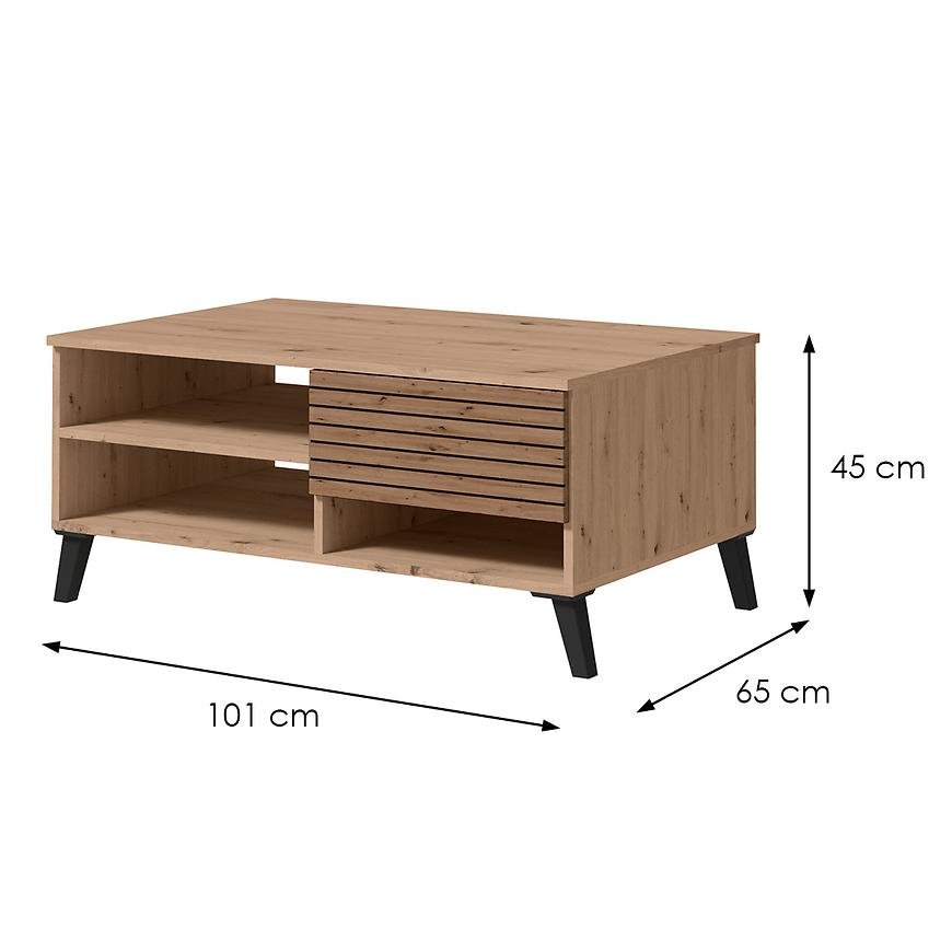Nowoczesna ława z serii Carlo to idealna propozycja do salonu w stylu nowoczesnym industrialnym lub loftowym Kompaktowa, funkcjonalna i estetyczna ława dopełni każdą aranżację. Całość wykonana jest z wysokiej jakości materiałów płyty wiórowej laminowanej w jasnym, drewnopodobnym wybarwieniu.