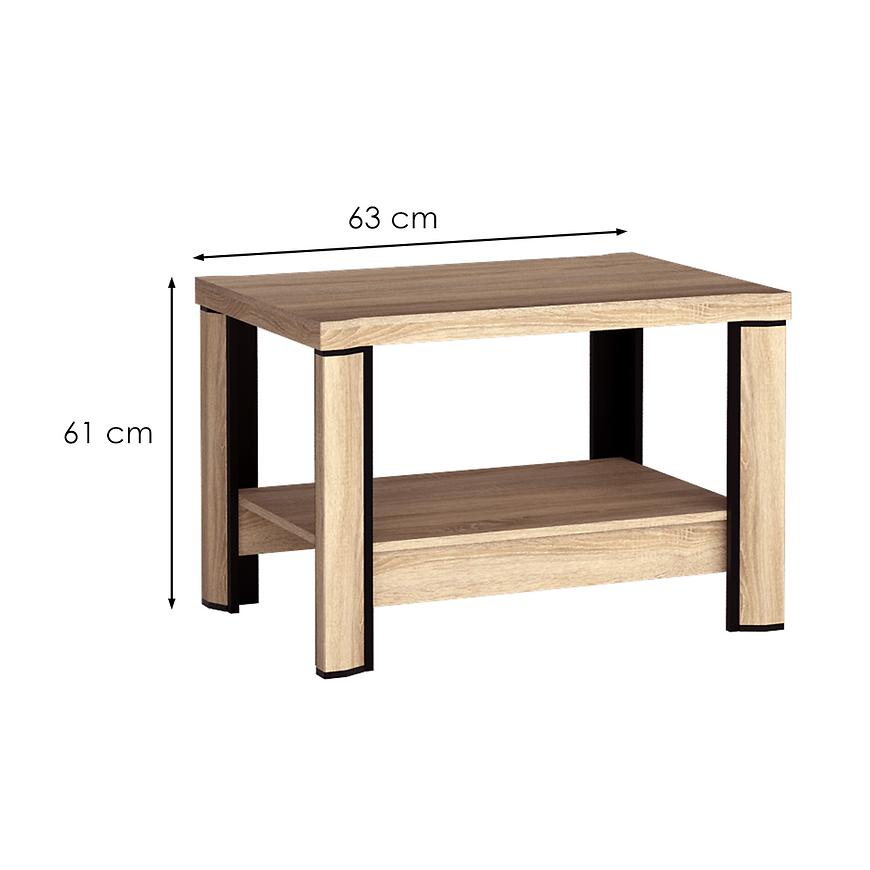 Ława Dallas D14 w kolorze dąb sonoma idealnie sprawdzi się w salonie, pokoju dziennym czy w innym, dowolnym pomieszczeniu. Posiada dużo miejsca na blacie. Wyposażona została w dodatkową półkę pod blatem. Dodatkowe czarne elementy nadadzą nowoczesny styl wnętrzu. Całość została wykonana z płyty wiórowej laminowanej.
