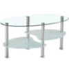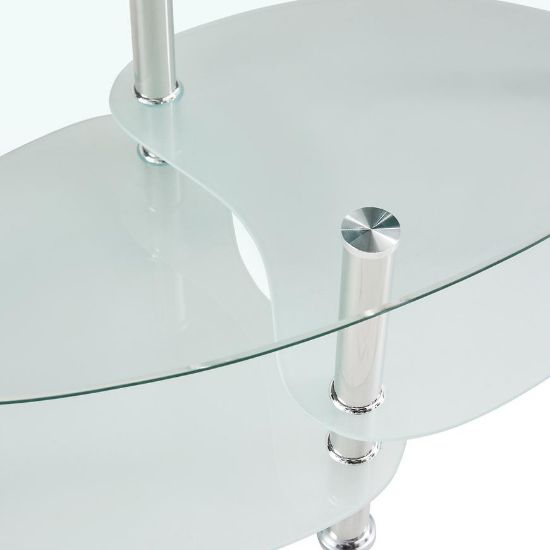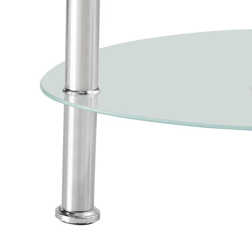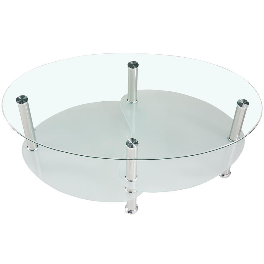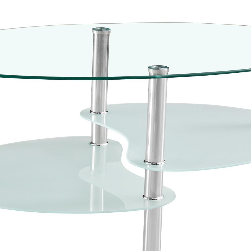 Blat wykonano ze szkła transparentnego z połyskiem, co optycznie powiększa przestrzeń i dodaje wnętrzu elegancji. Owalny kształt blatu nadaje meblowi lekkości i sprawia, że stolik doskonale komponuje się zarówno z prostymi, jak i zaokrąglonymi kanapami i fotelami.