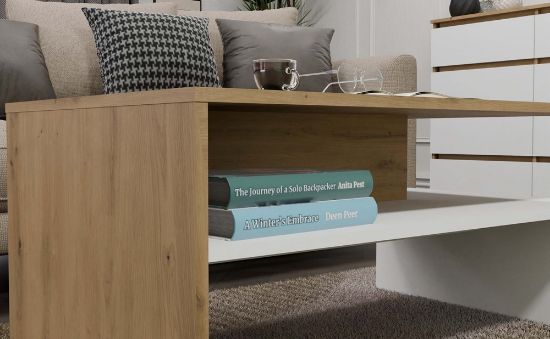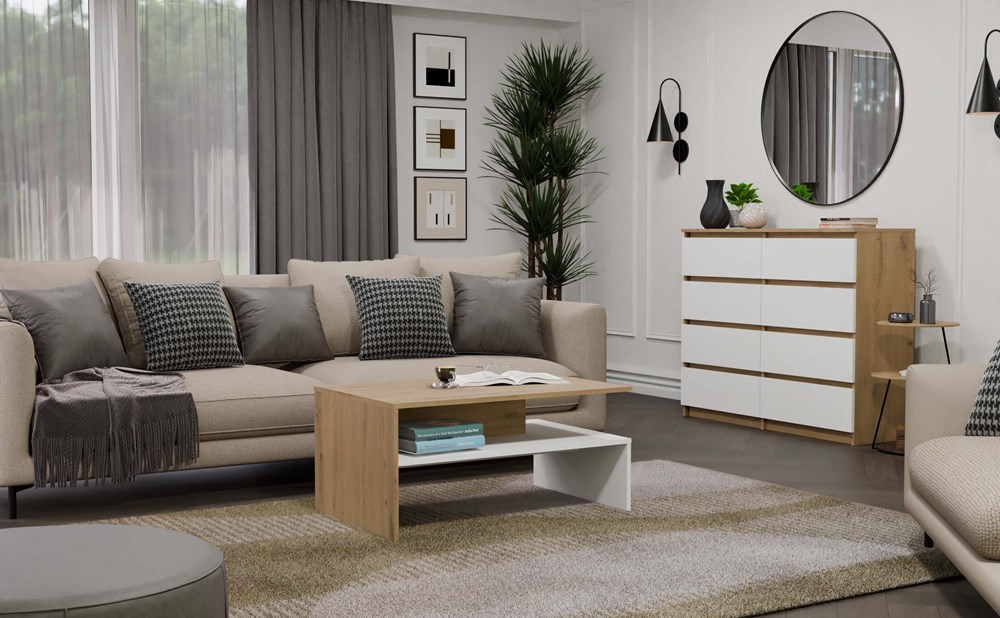 Ława Eva została wykonana z trwałej płyty laminowanej o grubości 16 mm, co zapewnia odporność na codzienne użytkowanie oraz łatwość w utrzymaniu czystości. Jej uniwersalne wymiary – wysokość 45 cm, szerokość 90 cm, głębokość 60 cm – sprawiają, że idealnie sprawdzi się jako stolik kawowy lub praktyczny element dekoracyjny w salonie.
