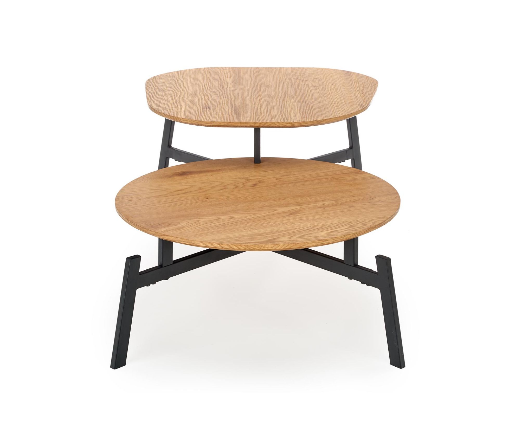 Blat ławy wykonany z płyty meblowej okleinowanej w kolorze dąb złoty prezentuje się nowocześnie i harmonijnie. Kolor dębowy wprowadza do wnętrza przyjemny akcent organiczny, który pasuje do różnych stylów aranżacyjnych. Dodatkowo, MDF okleinowany jest łatwa w utrzymaniu czystości i odporna na uszkodzenia. Stalowa konstrukcja, malowana proszkowo na czarno, nadaje ławie solidności i stabilności.