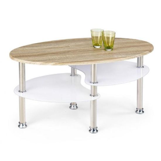 Ława Medea to ciekawe stylistycznie połączenie MDF-u z białym szkłem. Jej blat wykonany został z płyty MDF w kolorze dąb sonoma, posiada dwie praktyczne półki, które wykonane zostały ze szkła białego. Nogi ławy są chromowane.