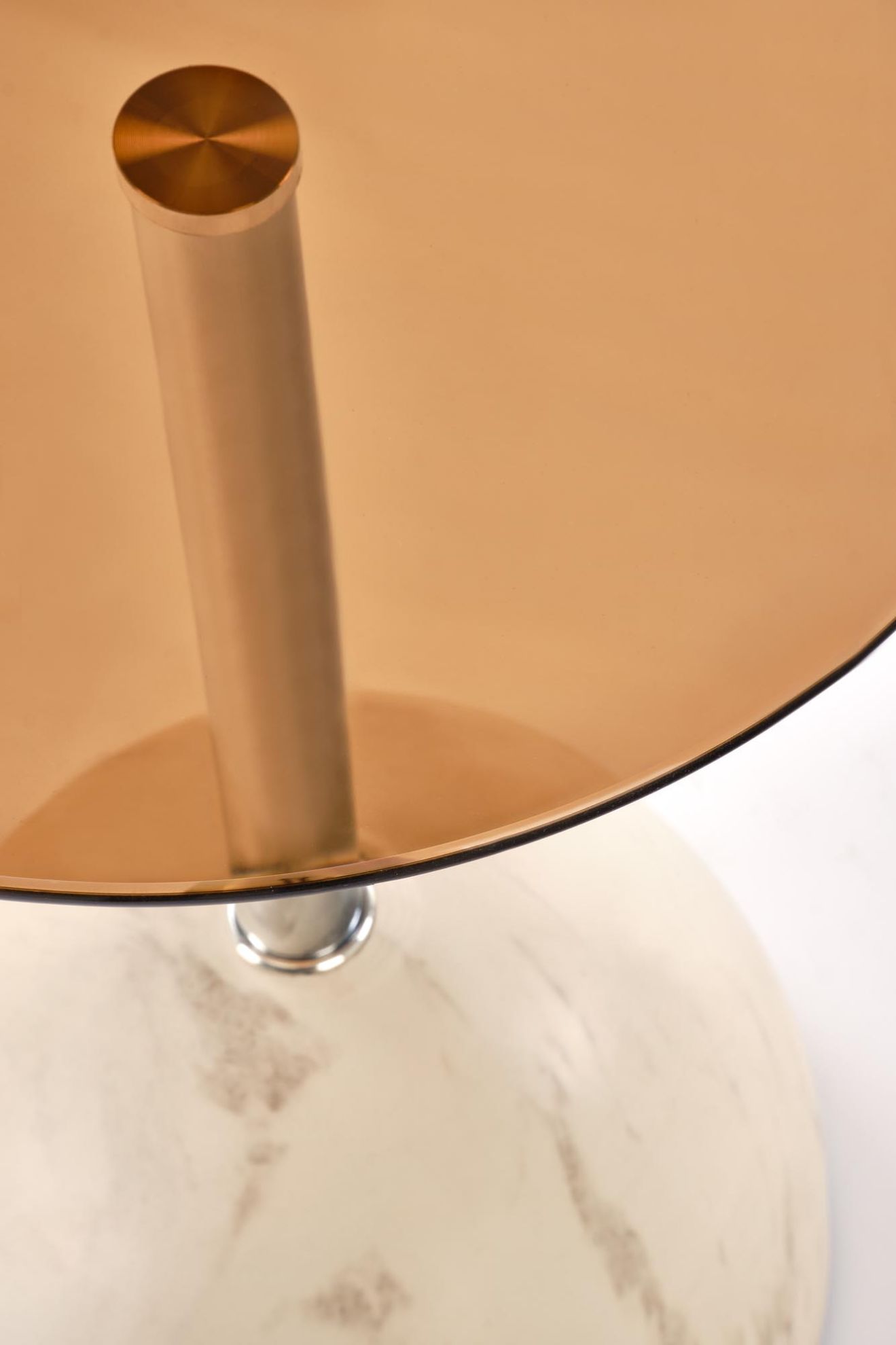 Połączenie naturalnego wzoru beżowego marmuru z eleganckim, brązowym szkłem sprawia, że ława Miro doskonale wpisuje się w modne aranżacje nowoczesne, glamour, modern classic oraz minimalistyczne. Marmurowy blat nadaje meblowi luksusowy wygląd, a szklane elementy wprowadzają lekkość wizualną, dzięki czemu stolik nie przytłacza przestrzeni. Okrągła forma blatu sprzyja wygodnemu użytkowaniu i pozwala na swobodne ustawienie ławy w centralnym punkcie salonu lub przy sofie.