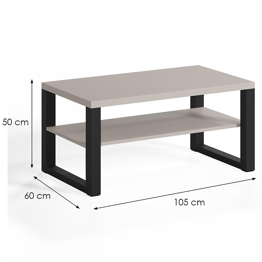 Nowoczesna ława Mona 1050 z półką w kolorze kaszmir/czarny łączy elegancję i funkcjonalność w salonie. Wykonana z trwałej płyty wiórowej laminowanej z matowym wykończeniem, oferuje prostokątny blat o wymiarach 105 × 60 × 50 cm oraz praktyczną półkę na drobiazgi. Stylowa kombinacja beżu i czerni wpasuje się w różne aranżacje wnętrz. Wymaga złożenia.