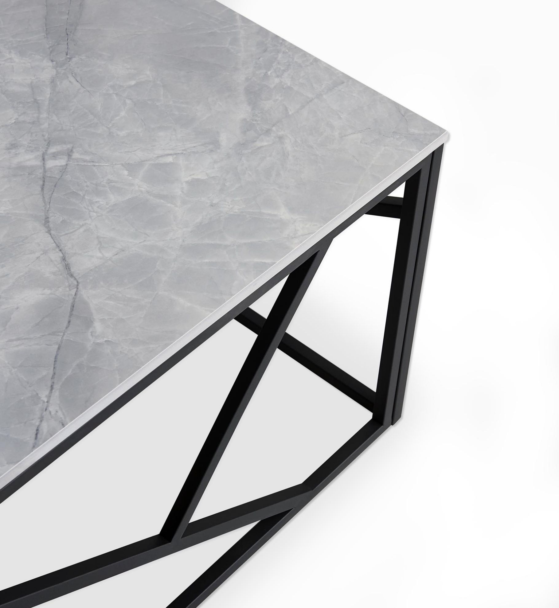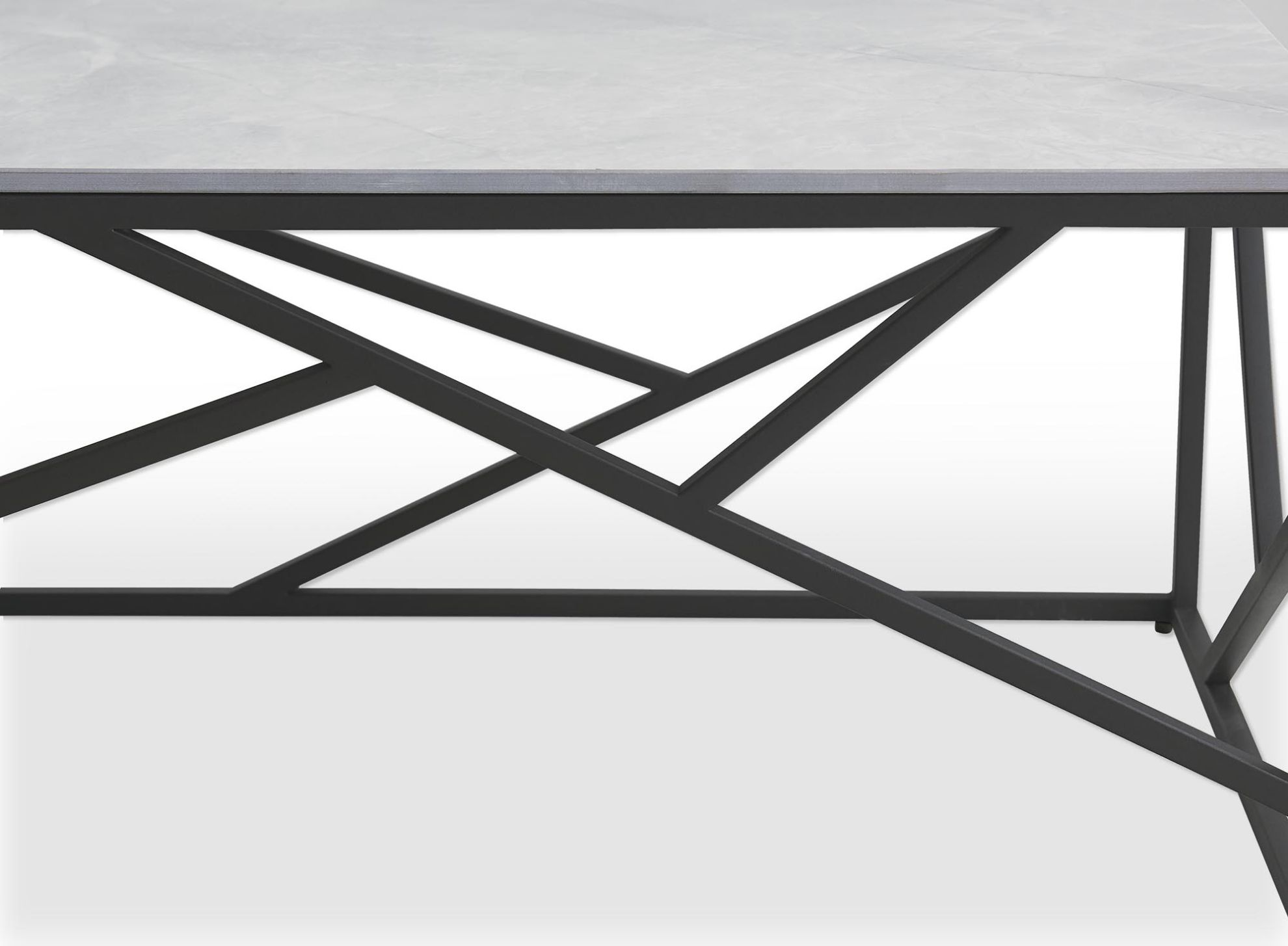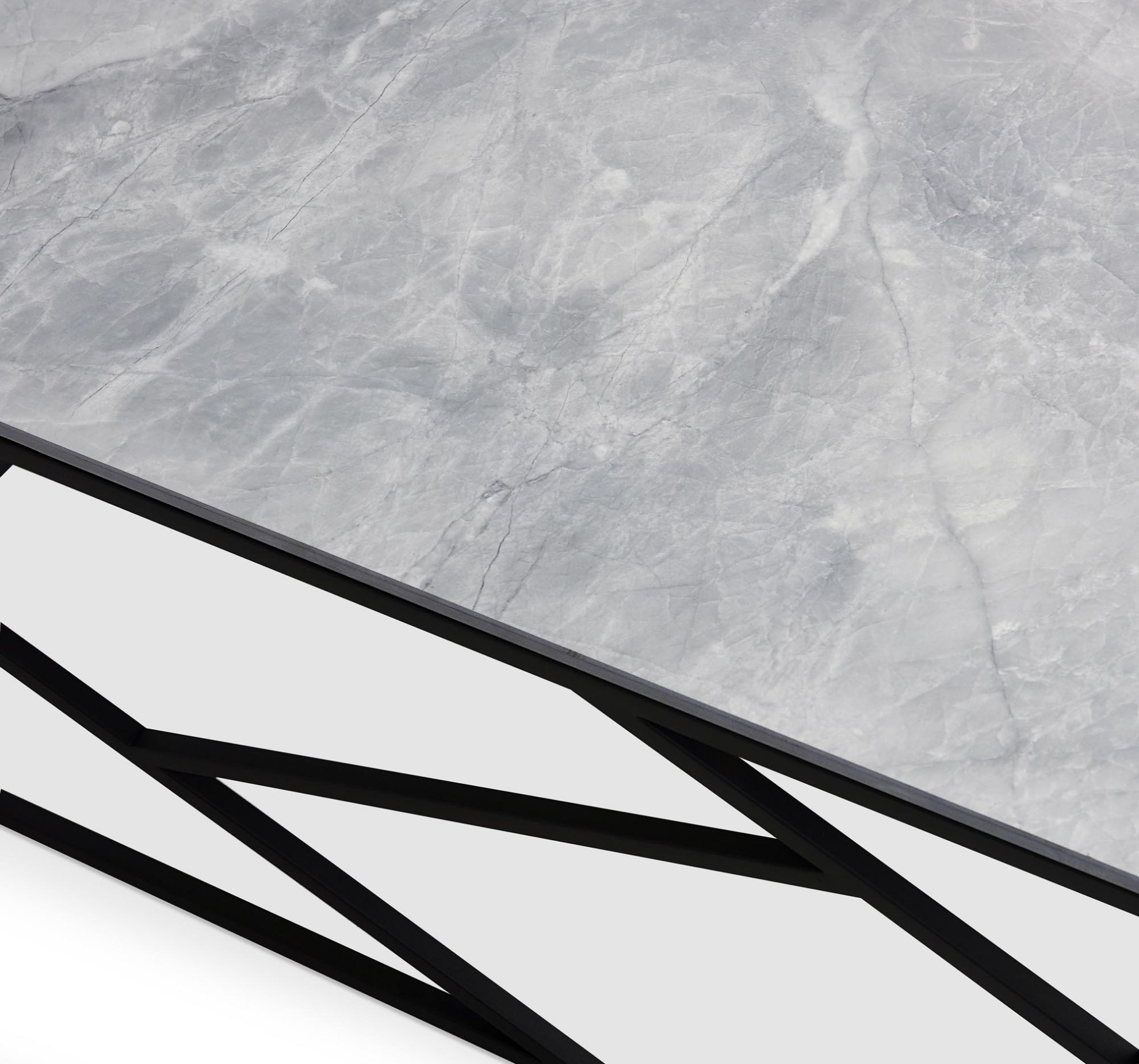 Blat ławy wykonany z materiału spiek w kolorze popielatego marmuru prezentuje się wyjątkowo i przykuwa uwagę. Naturalne wzory i struktura marmuru nadają meblowi unikalnego charakteru, wprowadzając do wnętrza atmosferę piękna i elegancji. Stalowa konstrukcja, malowana proszkowo, zapewnia ławie stabilność i wytrzymałość.