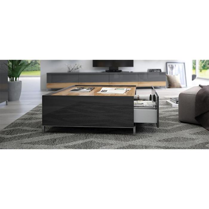 Kolekcja Onyx w kolorze anthracite/pacific walnut świetnie prezentuje się w nowoczesnych wnętrzach. Stolik doskonale sprawdzi się w każdym salonie lub innym, dowolnym pomieszczeniu. Wykonany jest z płyty wiórowej lakierowanej. Ława posiada szufladę, do której można schować rzeczy czy drobiazgi. Do kolekcji można dokupić inne meble.