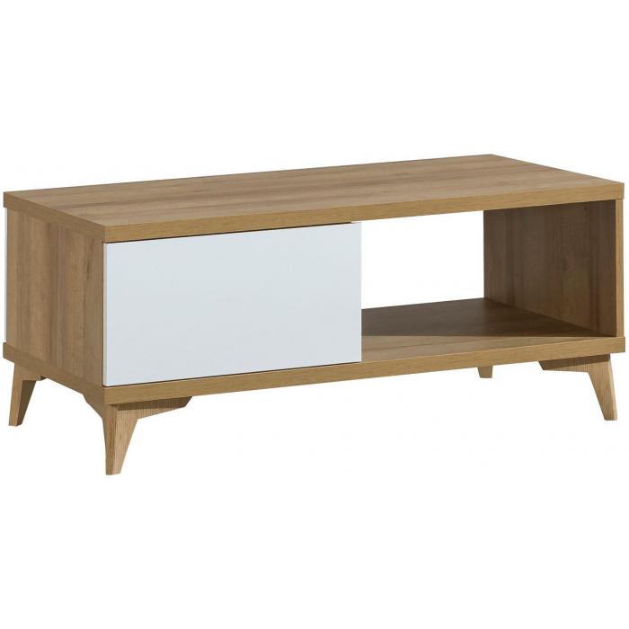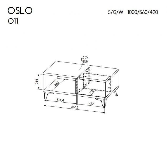 Ława Oslo dostępna jest w kolorze korpusu dąb riva, fronty drzwiczek wykonane w kolorze biały połysk. Ława osadzona jest na nóżkach wykonanych z plastiku. Maksymalne dopuszczalne obciążenie blatu wynosi 15 kg. Produkt przeznaczony do samodzielnego montażu.