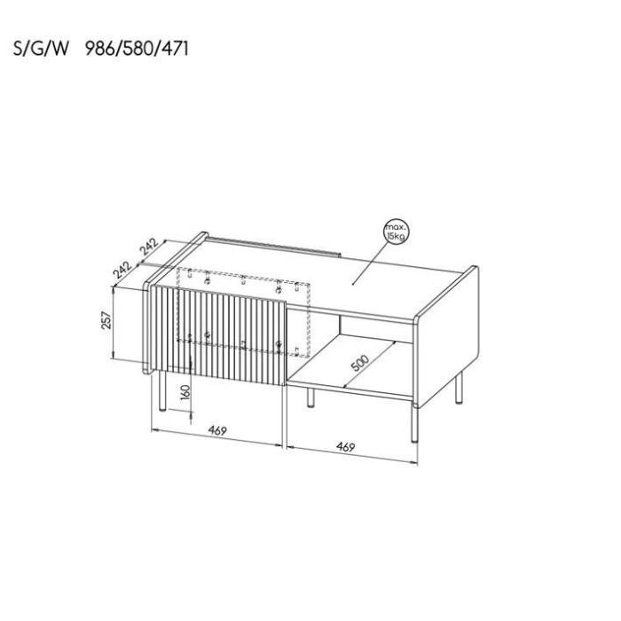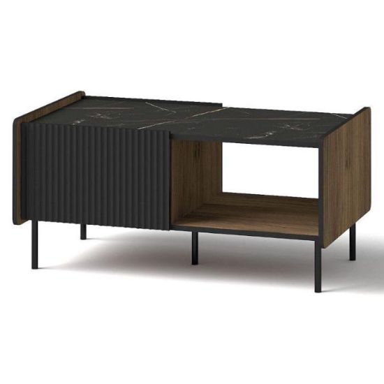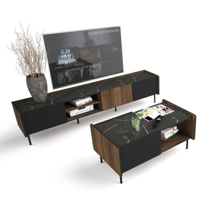 System TIVOLI to nowoczesny system pokojowy w kolorystyce orzech warmia, san sebastian. Na frontach jako element ozdobny zastosowano ryflowane wstawki MDF w kolorze czarnym. Nóżki wykonane z metalu w kolorze czarnym, natomiast uchwytywykonane zostały z tworzywa sztucznego. Produkt nie posiada oświetlenia LED. Dostępny w paczkach do samodzielnego montażu.