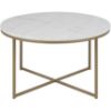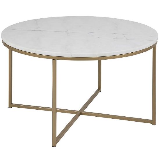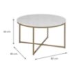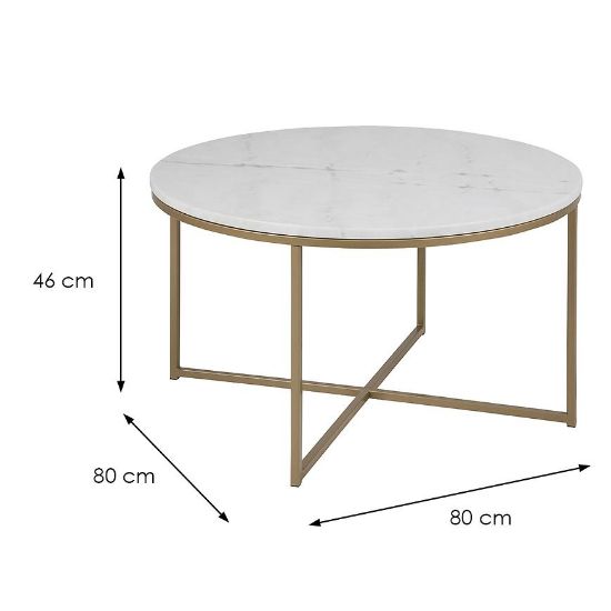 Zaczynając od wymiarów, ława osiąga wysokość 46 cm, szerokość 80 cm, a długość wynosi 80 cm. Kształt okrągły sprawia, że mebel doskonale komponuje się w różnych aranżacjach, a blat o świeżym wybarwieniu i białym marmurowym kolorze dodaje mu niepowtarzalnego charakteru.