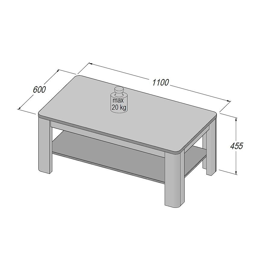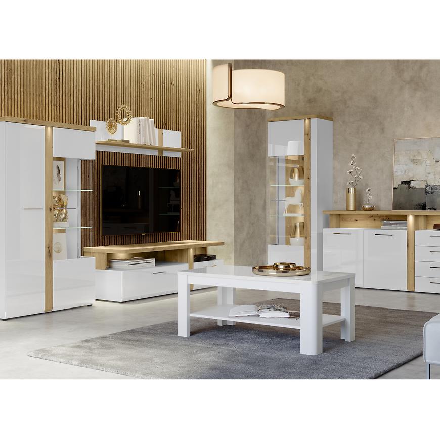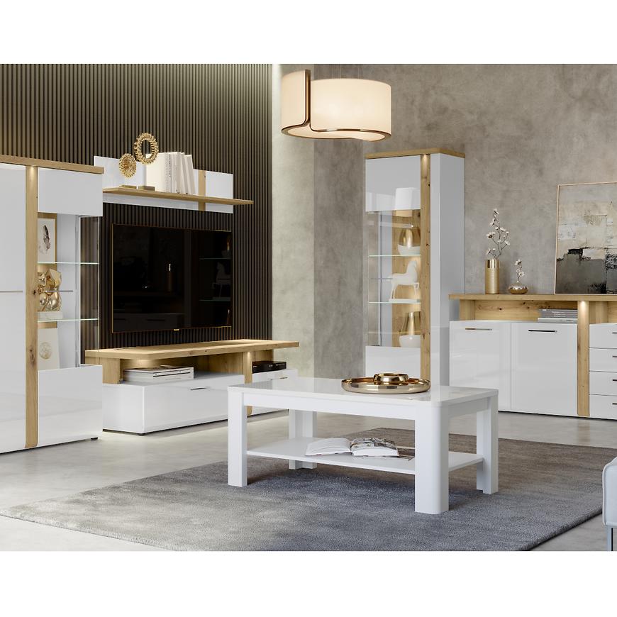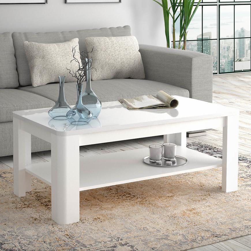 Blat z błyszczącym wykończeniem nadaje meblowi nowoczesnego charakteru, podczas gdy konstrukcja z płyty wiórowej laminowanej zapewnia trwałość i łatwość w utrzymaniu czystości.