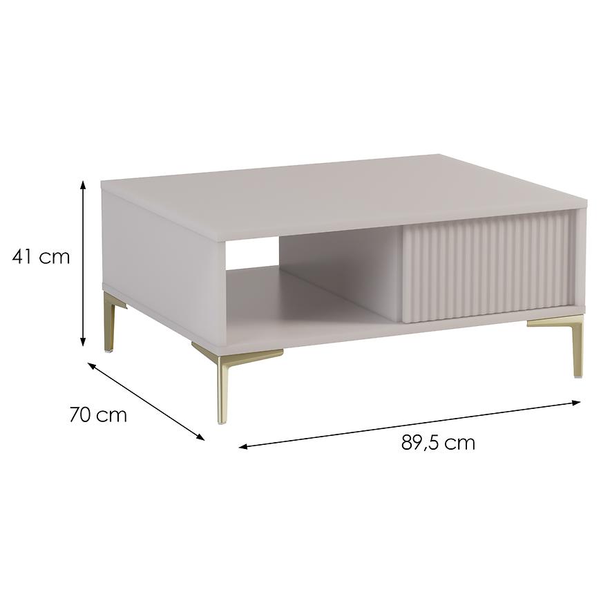 Blat o szerokości 89,5 cm i głębokość 70 cm oferuje przestrzeń idealną na codzienne użytkowanie, a matowe wykończenie dodaje elegancji i subtelności. Niska wysokość 41 cm sprawia, że ława doskonale sprawdzi się w salonach, wprowadzając do wnętrza nowoczesny, ale zarazem przytulny klimat.