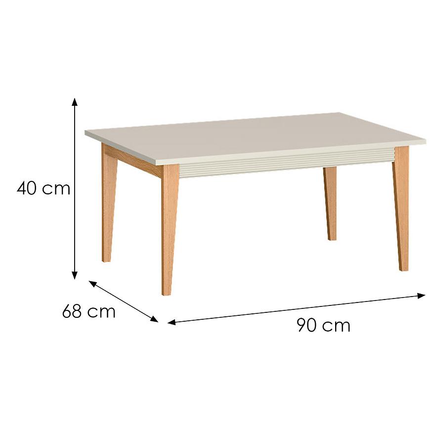 Mebel ma prostokątny blat o wymiarach 90x68 cm, wykonany z laminowanej płyty wiórowej z matowym wykończeniem. Ława waży 10,5 kg, co ułatwia jej przemieszczanie. Nie jest rozkładana i nie posiada regulacji wysokości, co czyni ją prostym i stylowym dodatkiem do każdego nowoczesnego salonu.