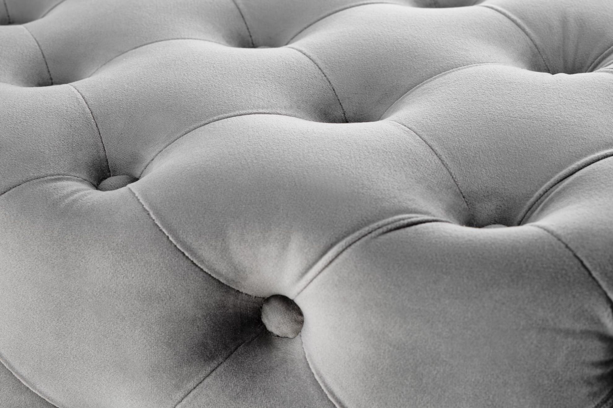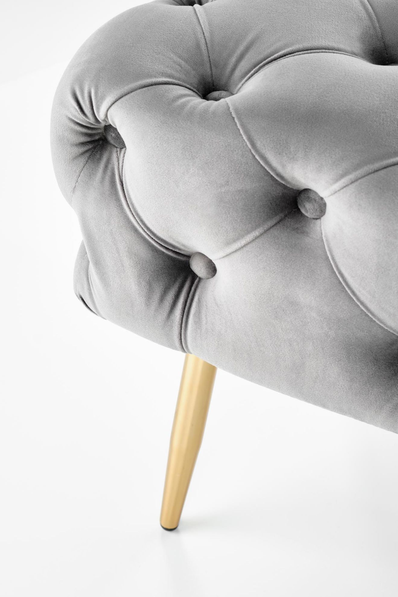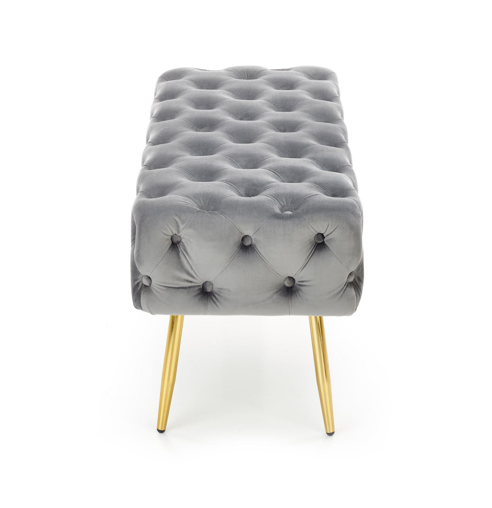 Siedzisko ławki Nata pokryto miękką tkaniną velvet, co zapewnia komfort użytkowania i przyjemność w dotyku. Popielaty kolor w połączeniu ze złotymi nogami tworzy elegancki kontrast, wprowadzając do pomieszczenia subtelny, nowoczesny akcent glamour.