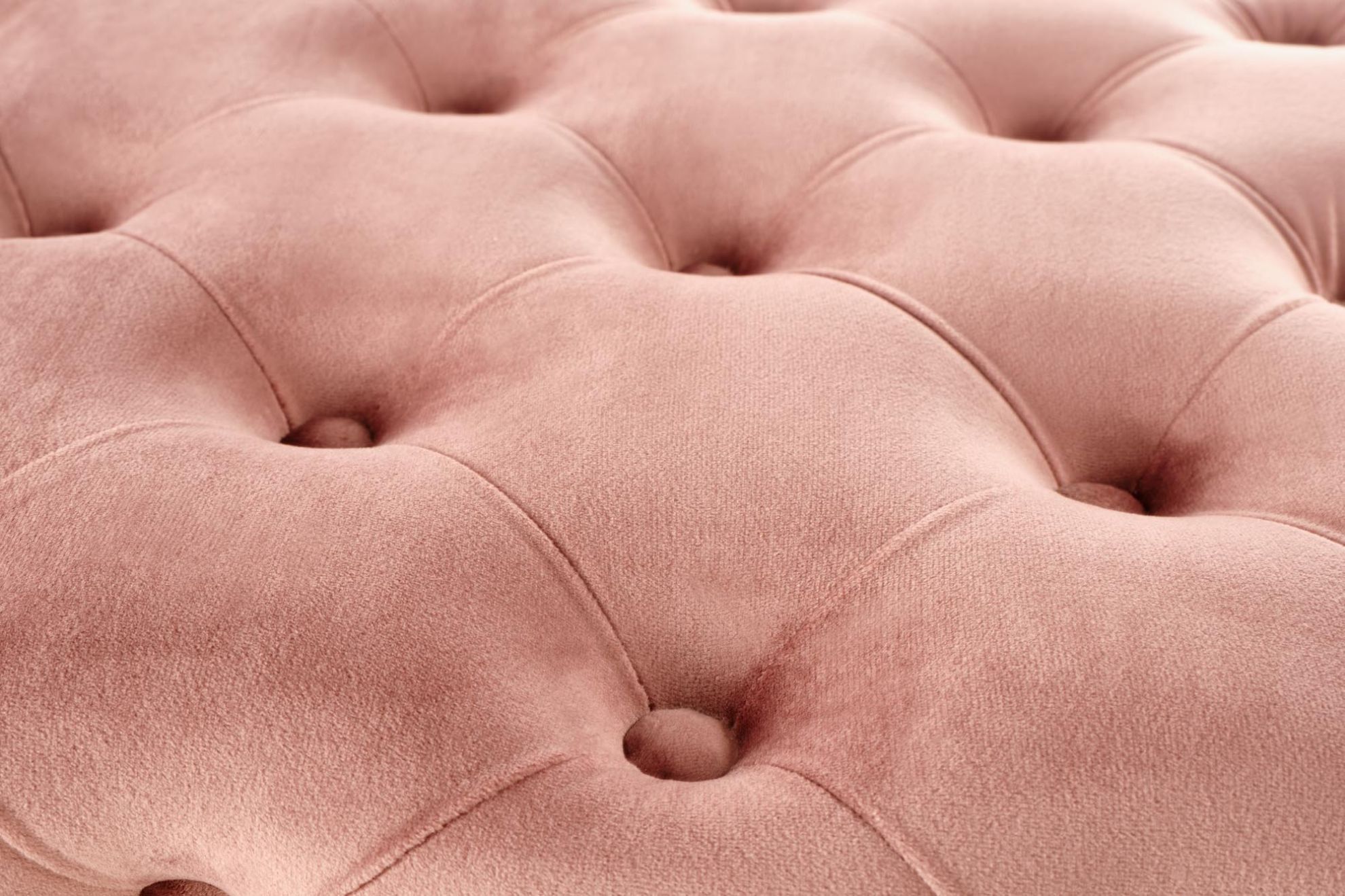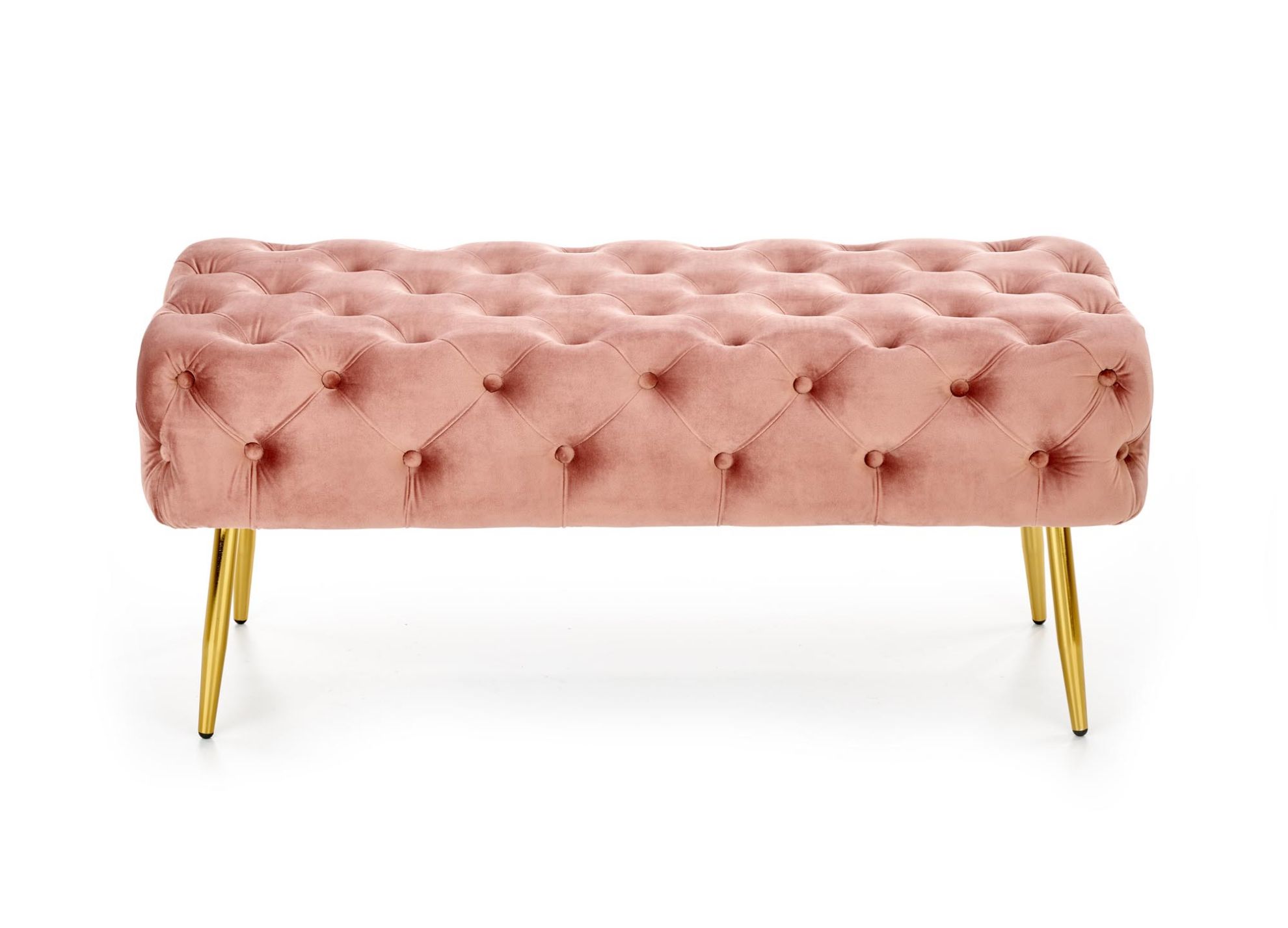Siedzisko ławki Nata pokryto miękką tkaniną velvet, która jest przyjemna w dotyku i komfortowa podczas użytkowania. Różowy kolor w połączeniu ze złotymi nogami tworzy elegancki kontrast, wprowadzając do pomieszczenia delikatną nutę glamour.