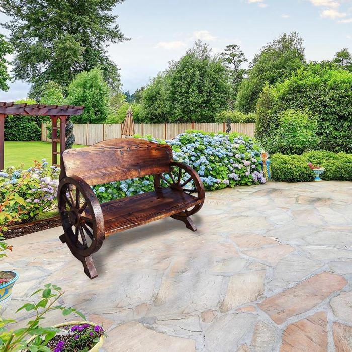 Ławka drewniana to świetny i funkcjonalny dodatek do każdego ogrodu. Ławka została wykonana w kolorze palonego drewna. Jest to ciekawa propozycja, która urozmaici aranżacje ogrodową, a przy tym zapewni wygodne miejsce do spoczynku. Dodatkowo ławka została ozdobiona marynarskimi kołami po bokach, które służą jako podłokietniki oraz podtrzymują całość konstrukcji. Dodatkowe nóżki stabilizują ławkę.