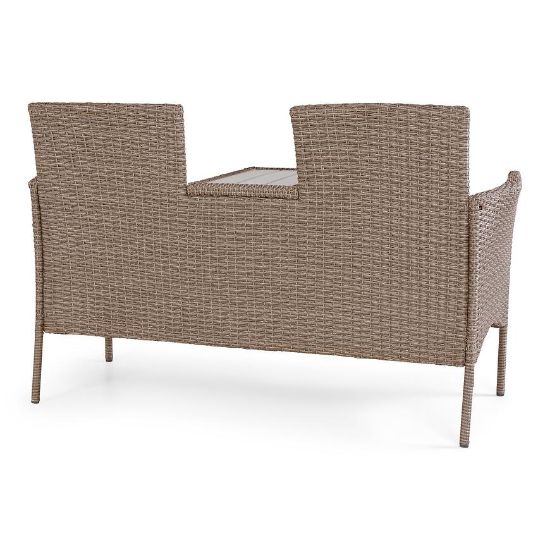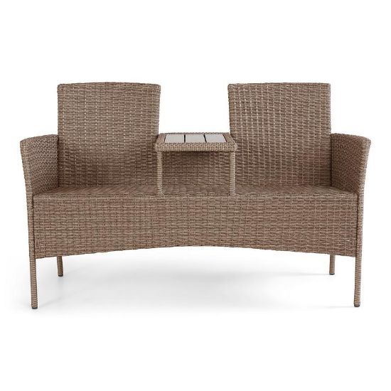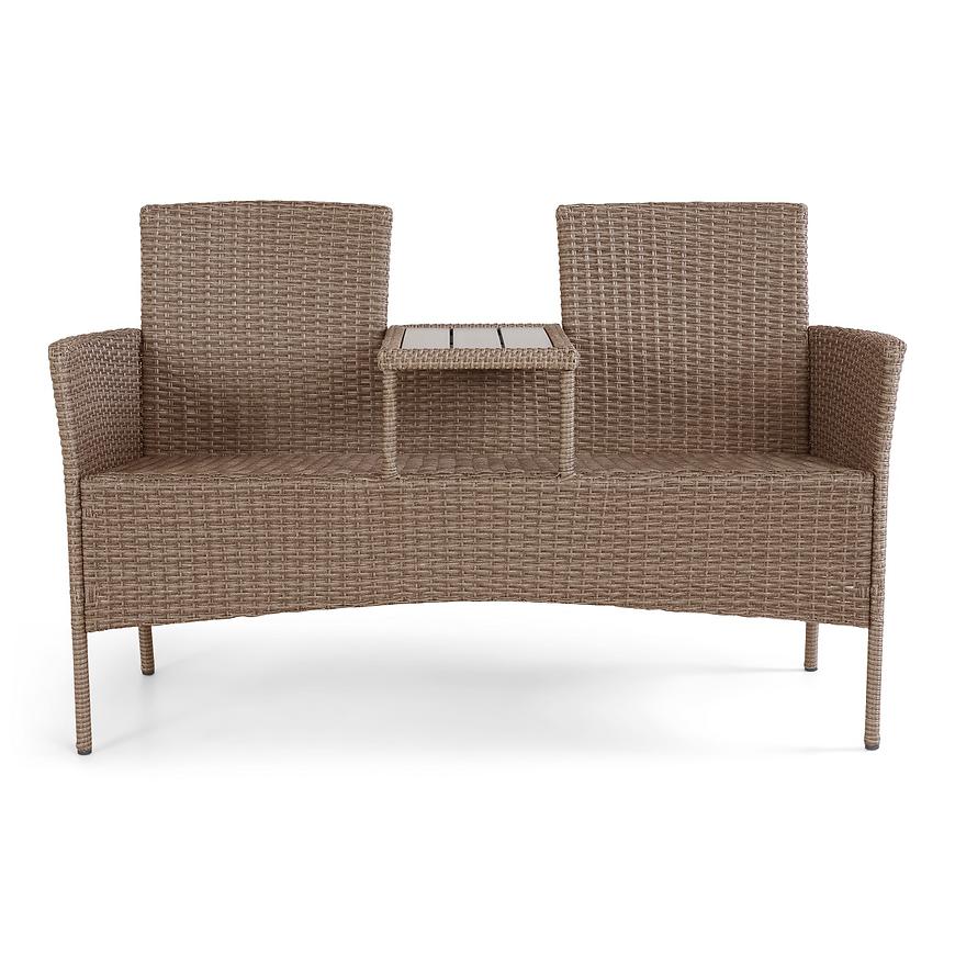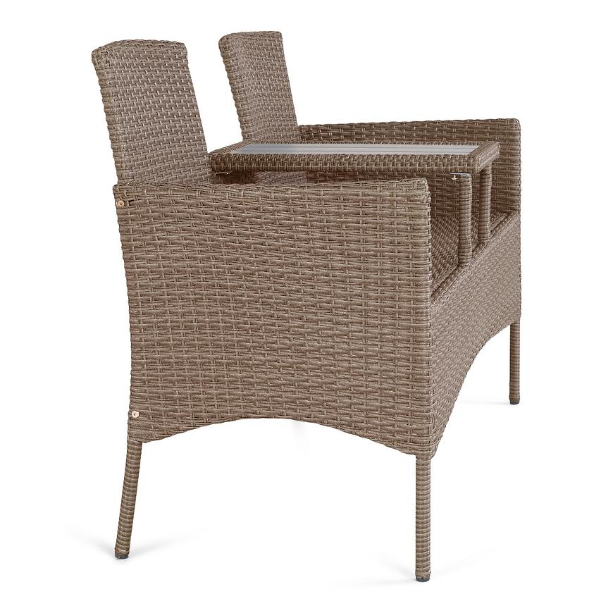 Jednym z wyróżniających elementów tej ławki jest niewielki blat z polywood umieszczony pomiędzy siedzeniami. To praktyczny dodatek, który może pełnić rolę stolika na kawę lub miejsca do oparcia dla wygody.