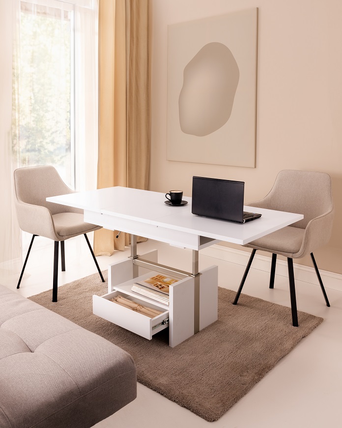 Dzięki zastosowaniu mechanizmu podnoszenia i rozkładania blatu na prowadnicy synchronicznej, zmiana wysokości i wielkości stołu odbywa się płynnie i bez wysiłku. W kilka chwil możesz uzyskać komfortową przestrzeń do wspólnego posiłku, pracy lub spotkań z przyjaciółmi.