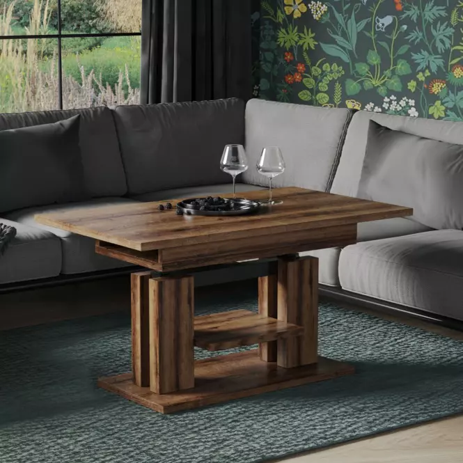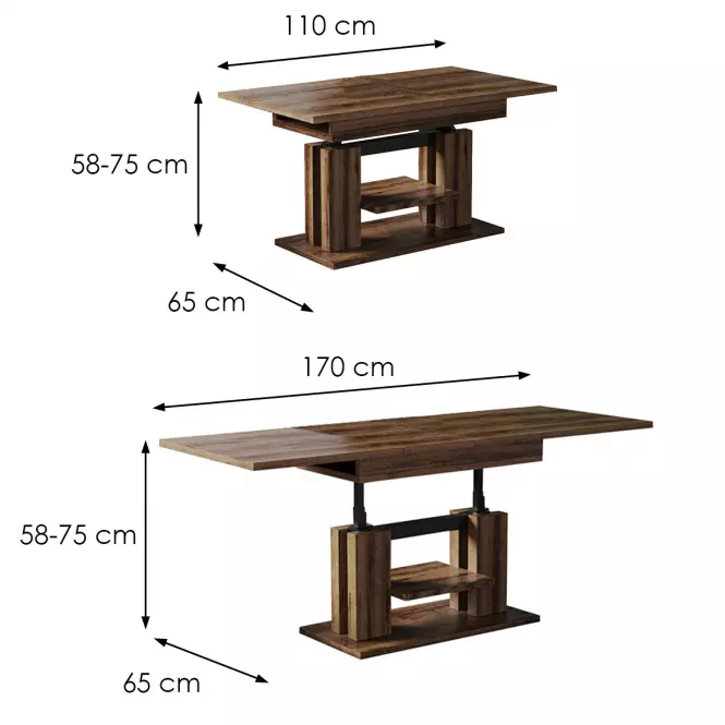 Blat wykonany z wytrzymałej płyty wiórowej wyróżnia się matowym wykończeniem, które dodaje mu nowoczesnego charakteru oraz sprawia, że jest łatwy w utrzymaniu czystości. Przed rozłożeniem jego długość wynosi 110 cm, jednak dzięki dwóm wkładkom o szerokości 30 cm każda, można go przedłużyć aż do 170 cm, co pozwala na wygodne pomieszczenie większej liczby osób. To praktyczne rozwiązanie doskonale sprawdza się zarówno w niewielkich przestrzeniach, jak i w większych salonach, gdzie ławostół może pełnić rolę głównego stołu.
