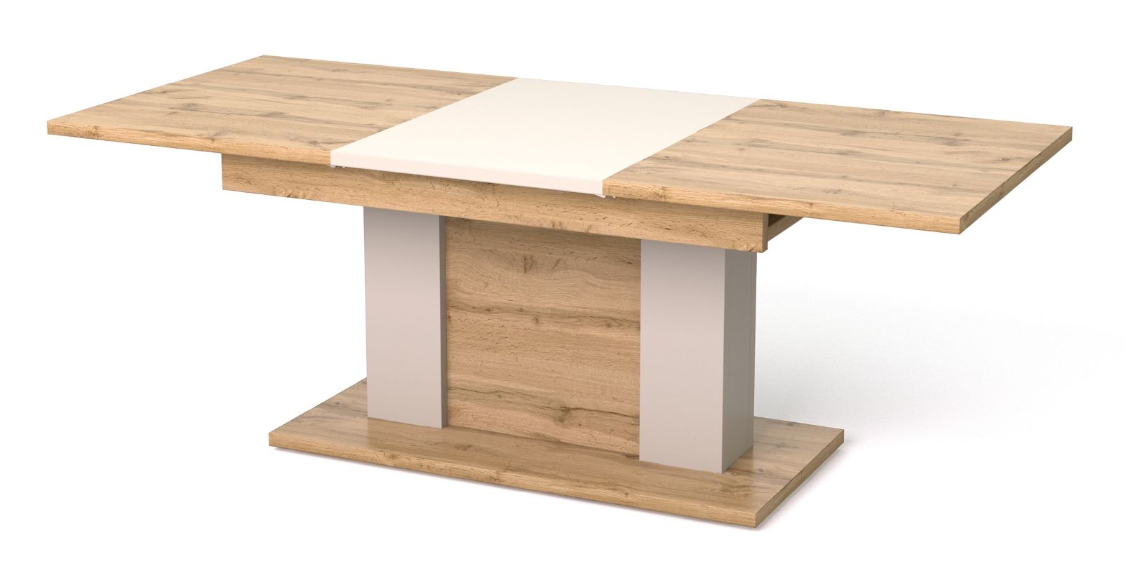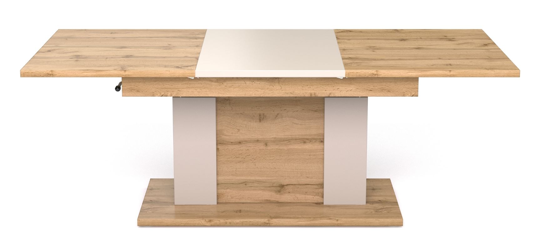 Ławostół Porta dąb wotan/kaszmir to funkcjonalny mebel łączący cechy ławy i stołu. Dzięki regulowanej wysokości i rozkładanemu blatowi idealnie sprawdza się zarówno jako niski stolik kawowy, jak i przestronny stół do codziennych posiłków lub przyjęć. Jego nowoczesny design w kolorze dąb wotan z akcentami kaszmir harmonijnie komponuje się z różnorodnymi aranżacjami wnętrz – od skandynawskich po minimalistyczne i industrialne.
