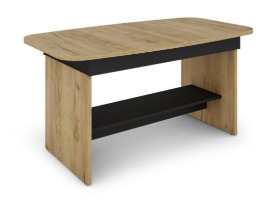 Blat z zaokrąglonymi rogami nie tylko podnosi walory estetyczne mebla, ale też zwiększa bezpieczeństwo – szczególnie w domach z dziećmi. Całość wykonana została z laminowanej płyty wiórowej, która zapewnia trwałość, odporność na ścieranie i łatwość czyszczenia.
